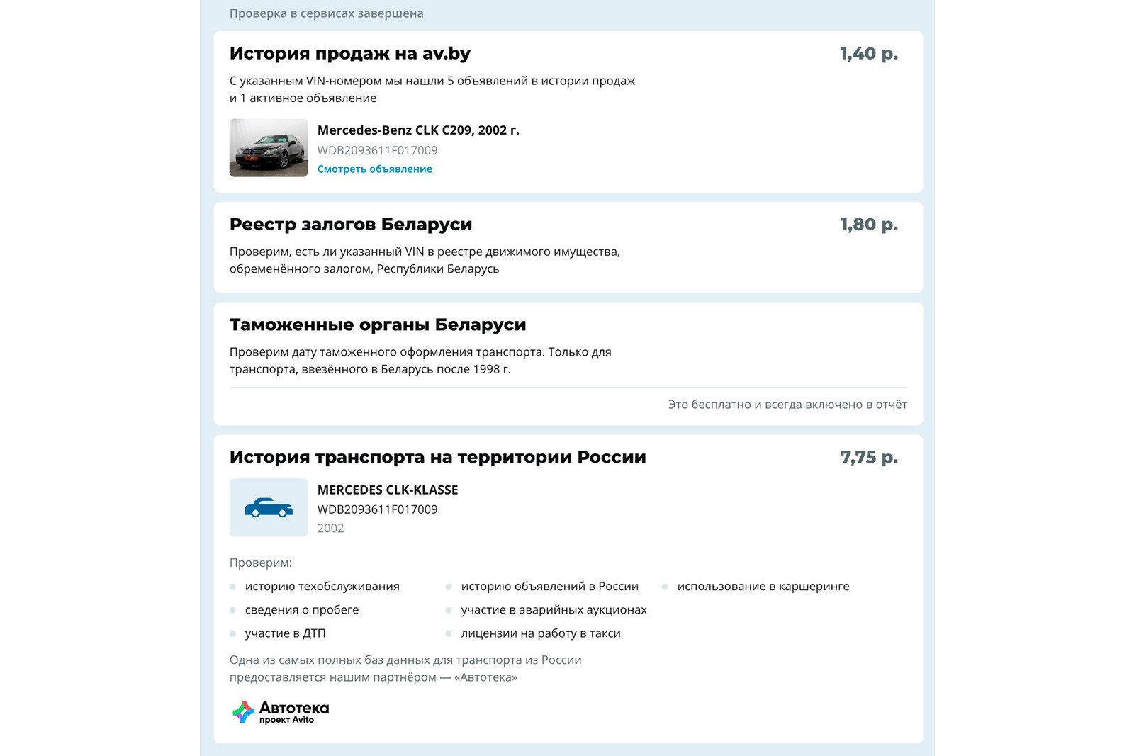 • После оплаты пользователь получает кобрендовый отчет, содержащий сведения из баз данных av.by и Автотеки и полную информацию об истории владения и эксплуатации транспортного средства как на территории Беларуси, так и на территории России.