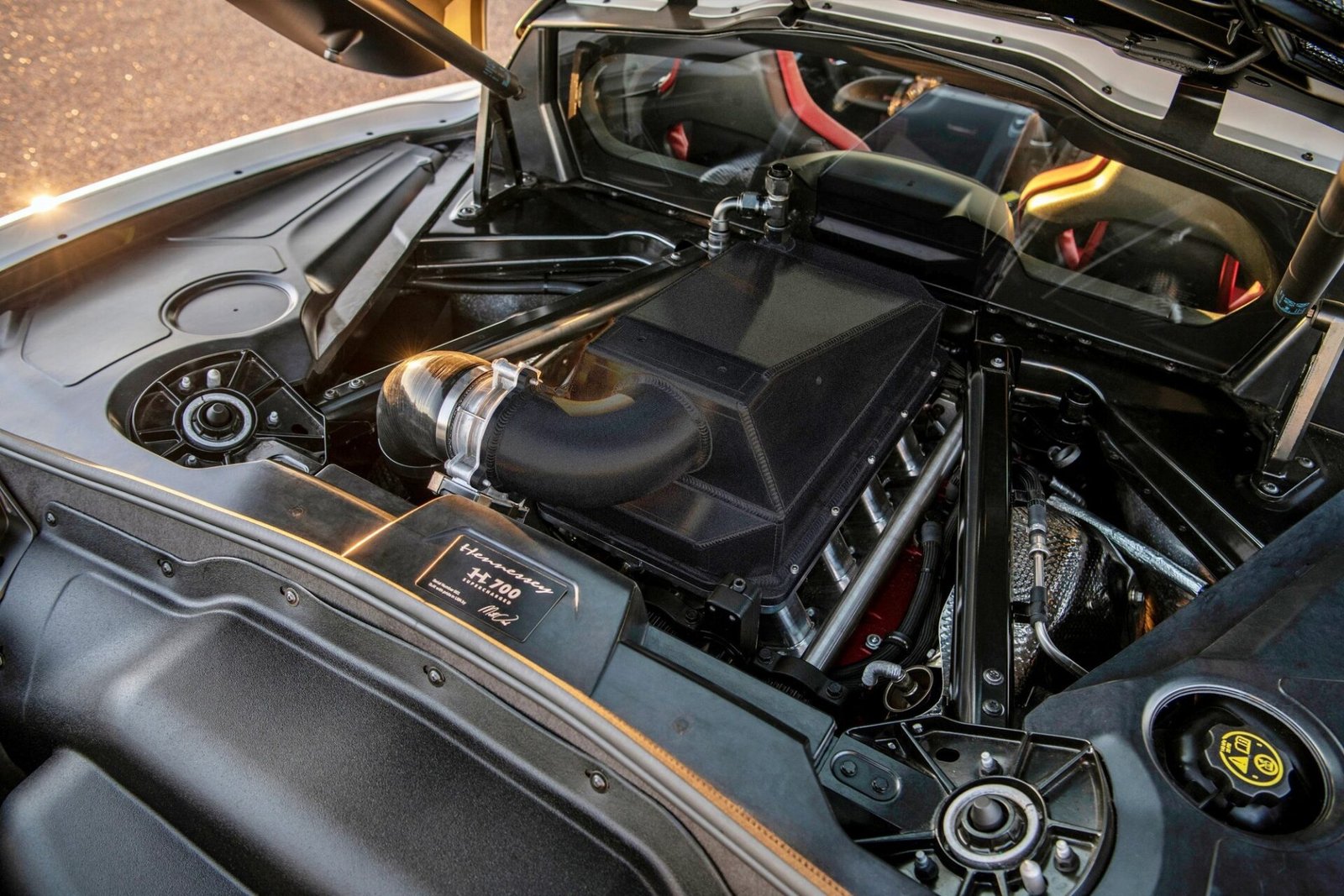 В комплекте с «улиткой» идёт интеркулер и модернизированная система впуска, в виде опции предлагается усовершенствованная система выхлопа. Отдача стокового нижневального 6,2-литрового V8 LT2 в результате увеличивается с 502 л.с. и 637 Нм до 718 л.с. и 865 Нм. Для сравнения скажем, что наиболее мощная из заводских версий Z06, оснащённая новым 5,5-литровый атмосферным V8 LT6, выдаёт 679 л.с. и 623 Нм, а представленный в прошлом месяце гибридный Corvette E-Ray — 664 л.с. Как изменились динамические характеристики машины, Hennessey, как обычно, не сообщает. Трансмиссия не изменилась: 8-ступенчатый «автомат» типа DCT (с двумя сцеплениями) передаёт всю мощность на задние колёса.