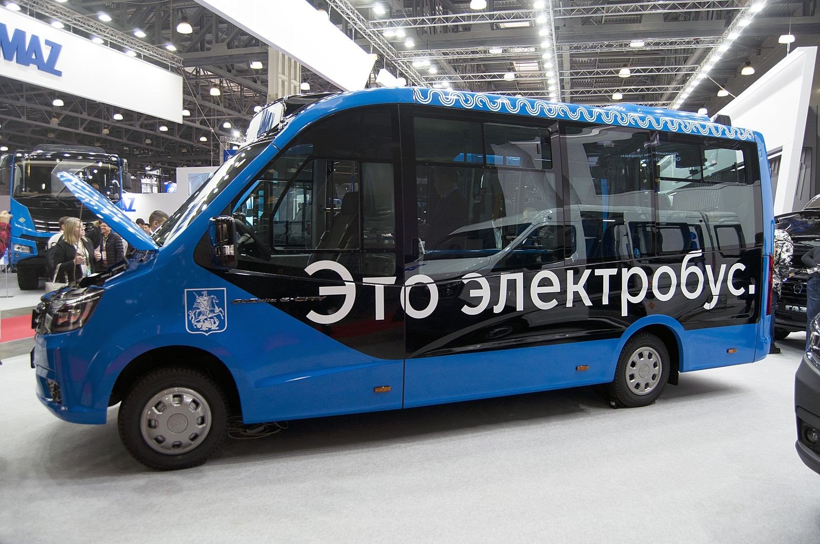 Итак, ГАЗель e-City. Конкретно этот экземпляр сделан по заказу ГУП «Мосгортранс» и имеет некоторые особенности, продиктованные требованиями заказчика. В первую очередь это заметно по расцветке – голубой с чёрной линией и с надписью «Это электробус». Передний бампер тоже окрашен в цвет кузова, а решётка радиатора осталась чёрной. И на ней видна фирменная «улитка» – эмблема Мосгортранса. Есть некоторые особенности в расположении поворотников, в колпаках дисков. В технике по желанию заказчика есть отличия в дверях: они с активной кромкой и кнопкой открывания двери.