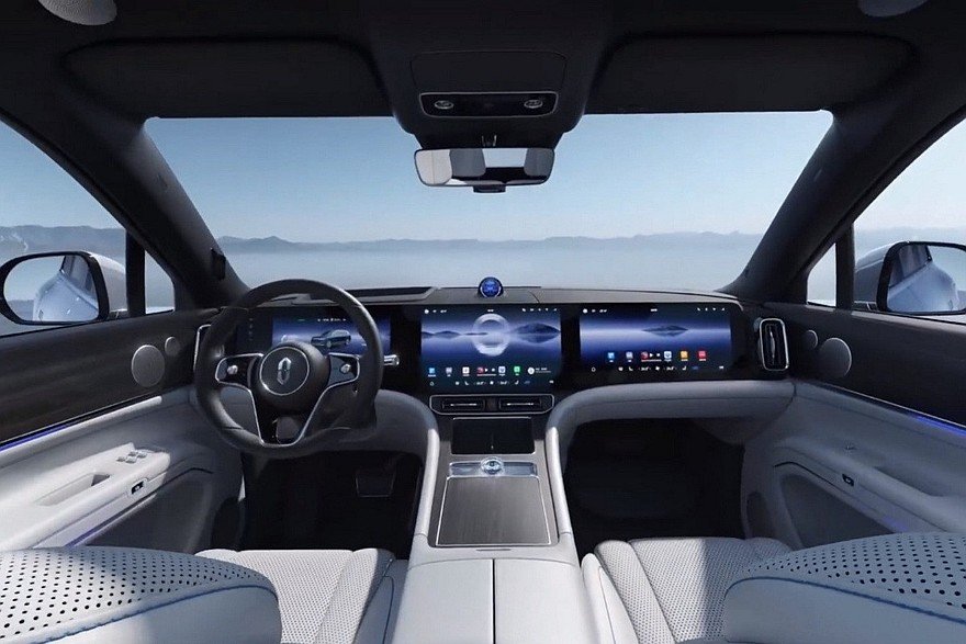 Внутри AITO M9 – три дисплея, причем они встроены в переднюю панель, как у последних Мерседесов (кстати, аналогичное решение получил и рестайлинговый кроссовер Exeed VX, который только что представили в России). Под центральными дефлекторами обдува расположены две площадки для беспроводной зарядки смартфона. Привычного селектора коробки нет – судя по всему, за управление трансмиссией отвечает подрулевой рычажок. Китайские профильные медиа также пишут, что M9 достался лазерный проектор – он крепится к крыше над вторым рядом кресел. А вот назначение элемента, торчащего из передней панели, пока непонятно. Разумеется, вся электроника – от Huawei.