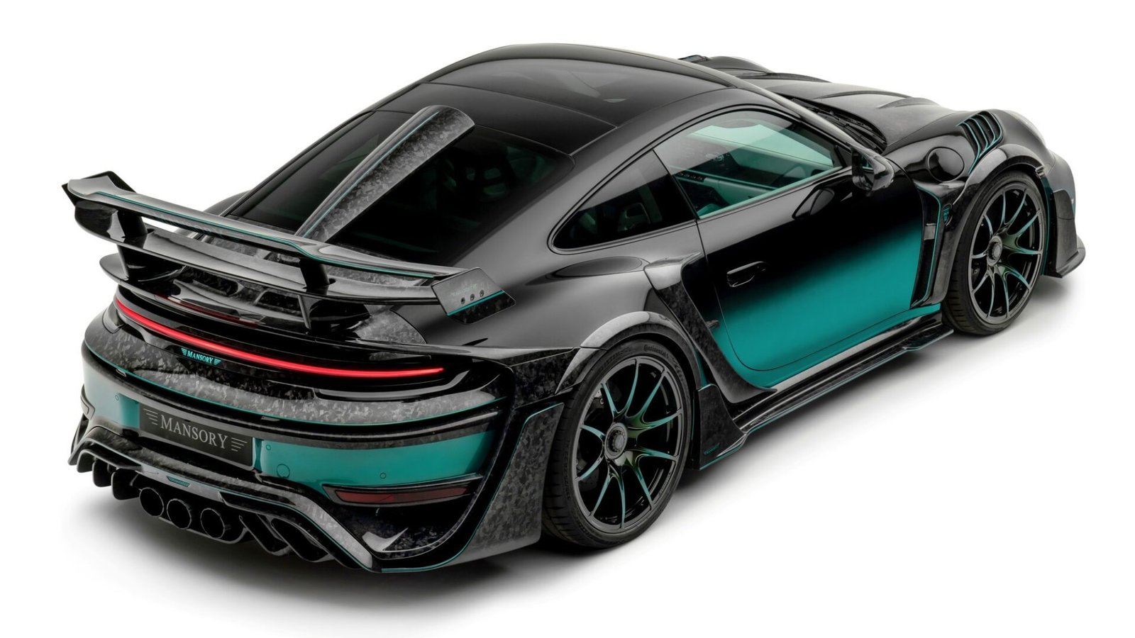 В задний бампер также встроен полностью новый диффузор с интегрированной в него трёхстволкой выхлопных патрубков. Размер всех воздухозаборников увеличен для лучшего охлаждения двигателя и тормозов. Изменён дизайн дневных ходовых огней. Новые наружные зеркала имеют форму, создающую дополнительную прижимную силу на высоких скоростях. Горбатый центральный воздухозаборник на корме — ещё один привет «Чужим». Градиентная окраска в сочетание с текстурой кованого карбона подчёркивает сложность аэродинамического оперения. Довершают образ ажурные кованые колёса Mansory FV.5C — 21-дюймовые на передней оси и 22-дюймовые на задней. Размерность шин — 255/35 ZR 21 спереди и 335/25 ZR 22 сзади.