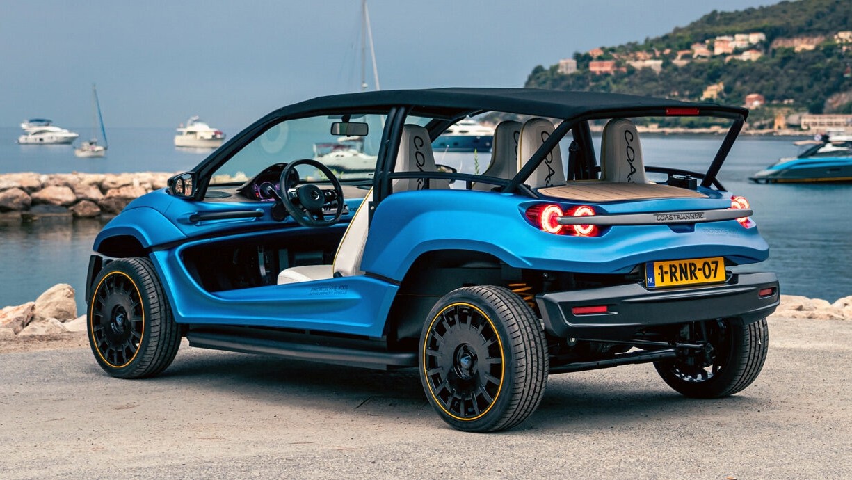 В основе Coastrunner лежит алюминиевая пространственная рама из профилей коробчатого сечения, к которой сверху крепится трубчатый стальной каркас крыши, наружные облицовочные панели изготовлены из лёгкого композитного материала, тканевую крышу можно смотать в рулон и наслаждаться солнцем. Дверей и боковых стёкол не предусмотрено, зато есть два багажника: основой в корме вмещает 250 л, а передний на 60 л — это полноценный холодильник, в котором уместится вся провизия для полноценного пикника на четверых. Весит Coastrunner всего 800 кг.