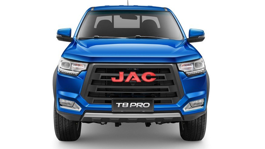 У рамного пикапа JAC T8 Pro полноценная двухрядная кабина, вместительная грузовая платформа, обвес по периметру кузова из некрашеного пластика, массивная чёрная радиаторная решётка с крупными горизонтальными элементами, а также большими буквами написанным названием бренда. В нижней части переднего бампера находятся интегрированные противотуманки, по бокам автомобиля можно увидеть подножки, традиционные наружные зеркала и обычные дверные ручки серебристого цвета.
