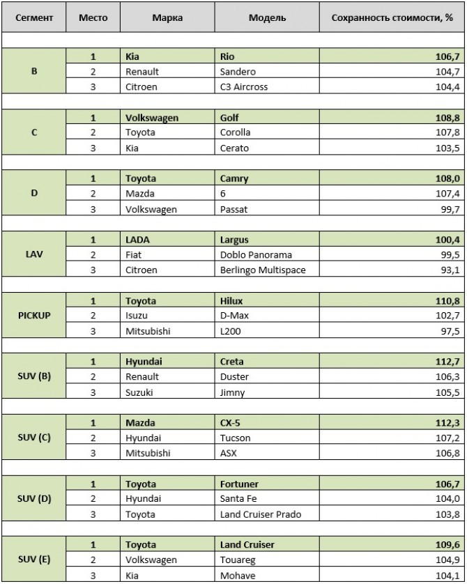 В сегменте В выгоднее всего для владельцев оказались Kia Rio (сохранение стоимости 106,7%), Renault Sandero (104,7%) и – неожиданно – редкий на наших дорогах Citroen C3 Aircross (104,4%). Схожая ситуация и во втором по популярности на российском рынке сегменте – среди В-кроссоверов. Первые две строки занимают бестселлеры Hyundai Creta (112,7%) и Renault Duster (106,3%). А на третьем месте оказался нишевый Suzuki Jimny (105,5%). Странности можно заметить и в других классах, поэтому нужно сделать ряд пояснений. После чего окажется, что на рейтинги стоит ориентироваться с несколькими оговорками.