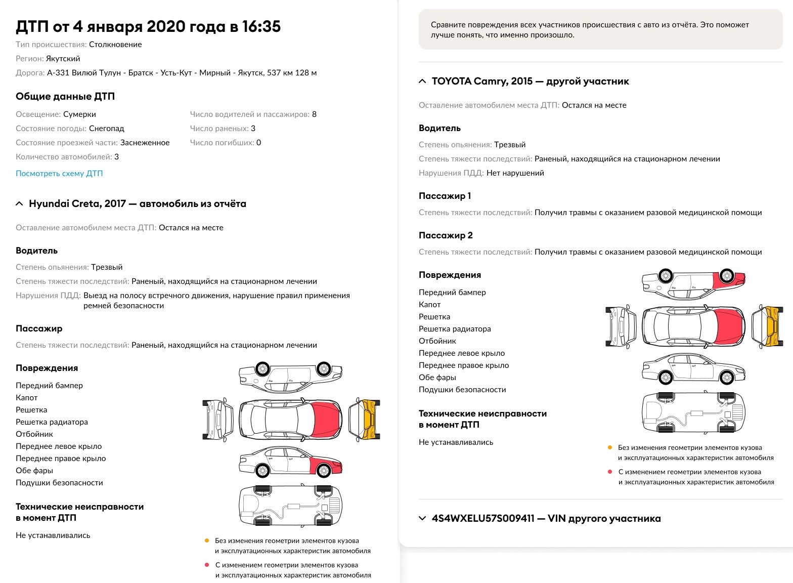 Автотека значительно расширила данные по ДТП. В случае, если проверяемый автомобиль побывал в дорожно-транспортном происшествии, и это было зафиксировано, пользователям сервиса теперь будет доступна вся информация о происшествии, включая момент столкновения, данные о повреждении всех участвующих авто, состояние здоровья водителей и участников ДТП, а также данные о нарушениях, повлекших за собой дорожно-транспортное происшествие. В отчетах Автотеки теперь отражено состояние здоровья водителя и всех пассажиров, добавлены данные о состоянии дорожного полотна, погодные условия на момент происшествия. Кроме того, в отчете теперь будут указаны марки и модели автомобилей, участвовавших в ДТП вместе с проверяемым автомобилем. Пользователи смогут купить отчеты по автомобилям-участникам ДТП, чтобы сравнить масштаб повреждений и стоимости ремонта в отчетах.