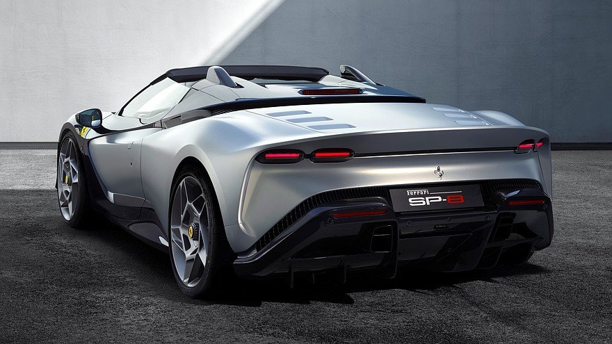 Крыша для SP-8 не предусмотрена в принципе, поэтому инженерам Ferrari пришлось тщательно поработать над аэродинамикой, чтобы уровень шума в салоне на высоких скоростях был приемлемым. Вместе с тем отсутствие крыши позволило полностью перекроить корму спорткара и снабдить её отдельными воздухозаборниками для двигателя и интеркулеров.