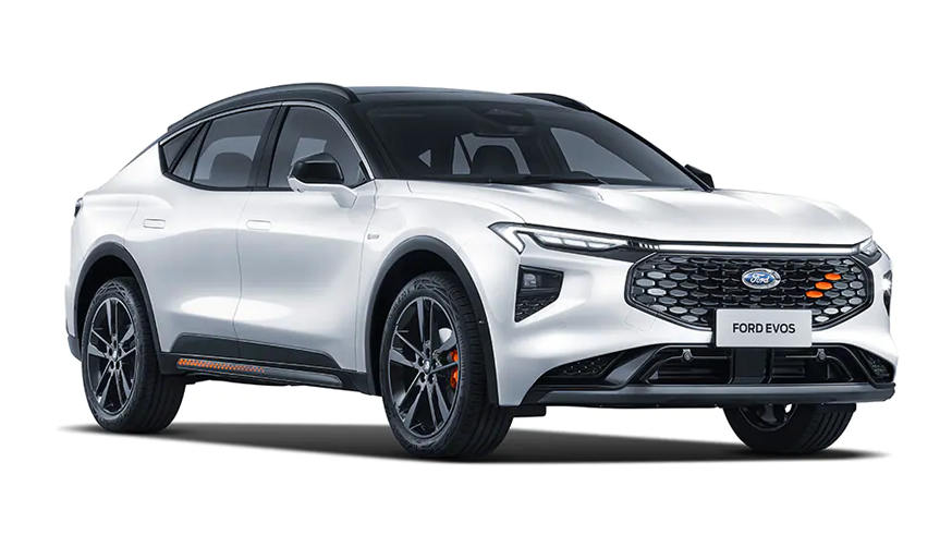 Передняя часть у новинки имеет много общих черт с трёхрядным кроссовером Ford Equator (его продажи стартовали в конце прошлого месяца, он представлен только в Китае). У автомобилей похожи капот, форма головной оптики, решётка радиатора, а также подобные, но более узкой формы воздухозаборники с «противотуманками», интегрированные в передний бампер. А у Ford Mustang Mach-E будущая «пятидверка» позаимствовала оформление профиля, только у Evos уже привычные «утопленные» дверные ручки, а не кнопки, как у электрокара.