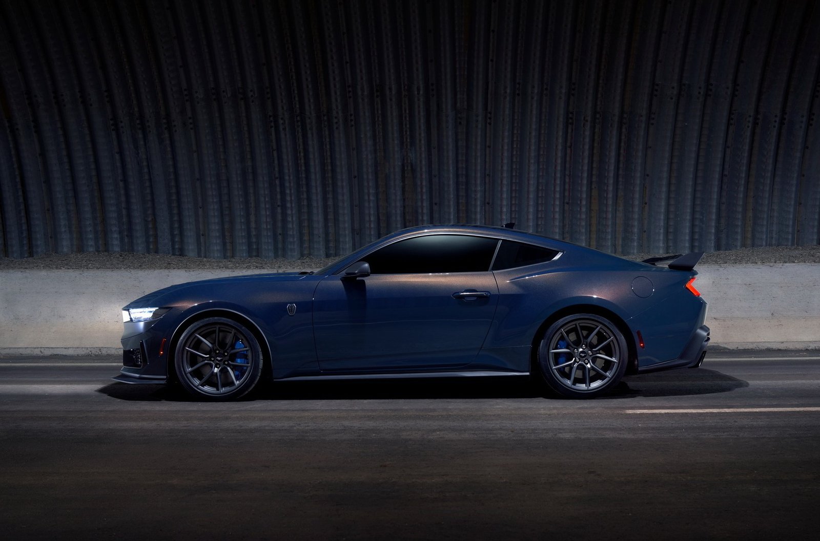 На промофото Mustang Dark Horse пофарбований у опціональний синій колір Blue Ember із ефектом перламутру. На капоті — опціональні вінілові наклейки, розфарбовані вручну. Пакет Appearance Package продовжує ці смуги на дах та корму.