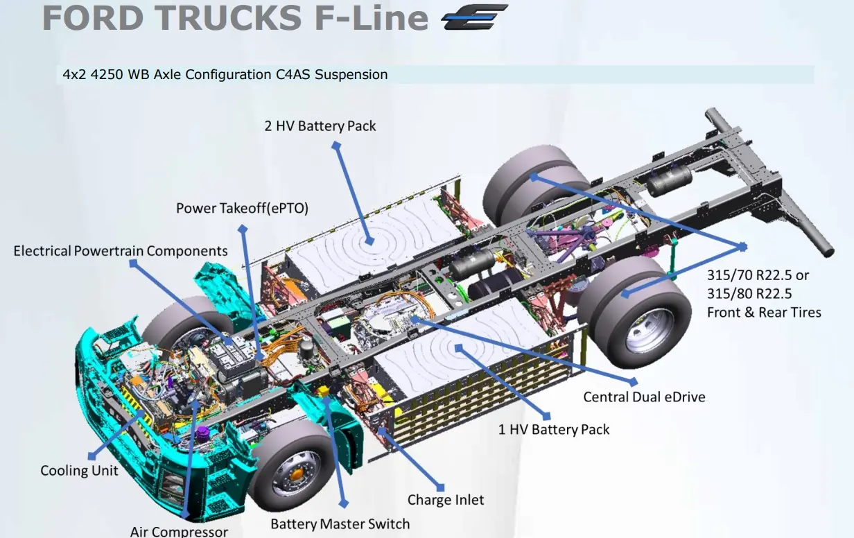 Компанія Ford Trucks нещодавно поповнила свій модельний ряд електровантажівками сімейства F-Line Е. Це шасі колісної формули 4х2 та 6х2, розраховані на повну масу 19 та 27 т при власній вазі 7,9 та 9,3 т відповідно. На вибір пропонуються різні колісні бази: від 4250 мм до 6550 мм. Автомобілі оснащуються денною кабіною завширшки 2,2 м.