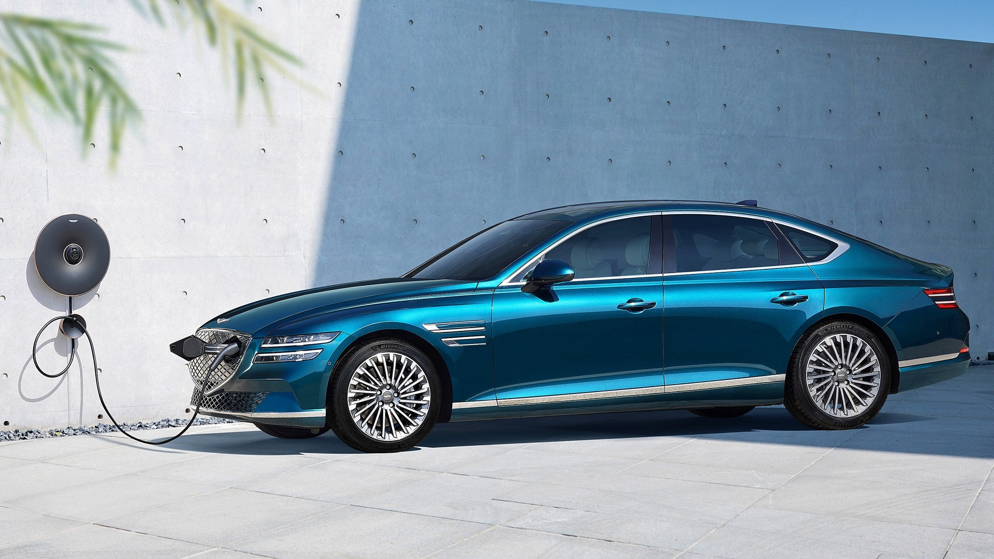 Снаружи Genesis Electrified G80 отличается от бензиновых и дизельных собратьев глухой фальшрадиаторной решёткой с ромбовидным рисунком, в которую врезан лючок для зарядки, и более лаконичным передним бампером. Дизайн заднего бампера также изменён, выхлопные патрубки с него, понятное дело, исчезли.