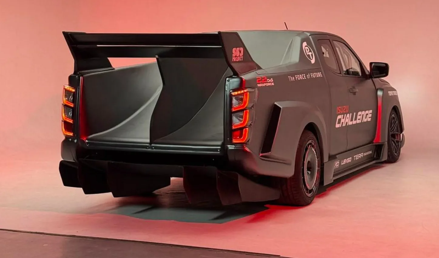 Новинка отримала назву Isuzu Challenge D-Max і виглядає так, ніби щойно зійшла з гоночної траси. Пікап D-Max оснастили особливим аеродинамічним обвісом, розробленим компанією Tera Engineering, регульованим сплітером та збільшеним повітрозабірником у передньому бампері. Також встановили капот з карбону, величезне регульоване антикрило на кормі і занизили дорожній просвіт. Завершують образ ковані легкосплавні диски Lenso, взуті у високопрофільні шини Toyo Proxes Sport.