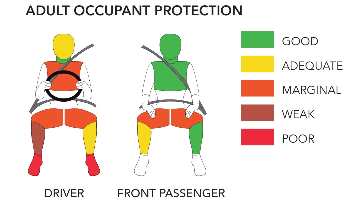 Toyota Urban Cruiser с двумя фронтальными подушками в базовой комплектации — это клон популярного индийского кроссовера Maruti Suzuki Vitara Brezza, он получил четыре звезды за защиту взрослых и три звезды за защиту детей. Риски для детей — те же, что у моделей Hyundai (нет креплений Isofix, нет нормального центрального ремня безопасности), а взрослым в Тойоте, по крайней мере, не угрожают смертельно опасные нагрузки — красного и коричневого цветов в протоколе нет.