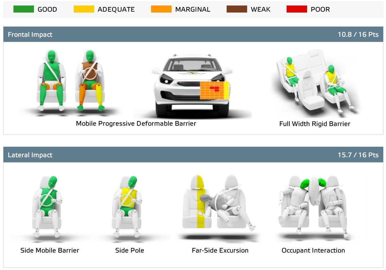 На груди и правом бедре манекена-водителя датчики зафиксировали высокий (коричневый цвет) уровень нагрузок, грозящий тяжёлыми травмами, которые могут оказаться несовместимыми с жизнью. Госпитализация при таких нагрузках практически неизбежна. В этом же тесте эксперты отметили высокий риск получения травм ног передних седоков из-за контактов с твёрдой приборной панелью. Большая масса Sorento (1847 кг) — это дополнительный риск для пассажиров встречного авто (имитирующая его тележка со сминаемым барьером имеет массу 1400 кг), за что «корейцу» тоже снизили оценку. Наконец, на шее манекена, имитирующего 10-летнего ребёнка на заднем сиденье, зафиксирован пограничный оранжевый уровень нагрузок — риск получения травм в этой чувствительной зоне довольно серьёзный.