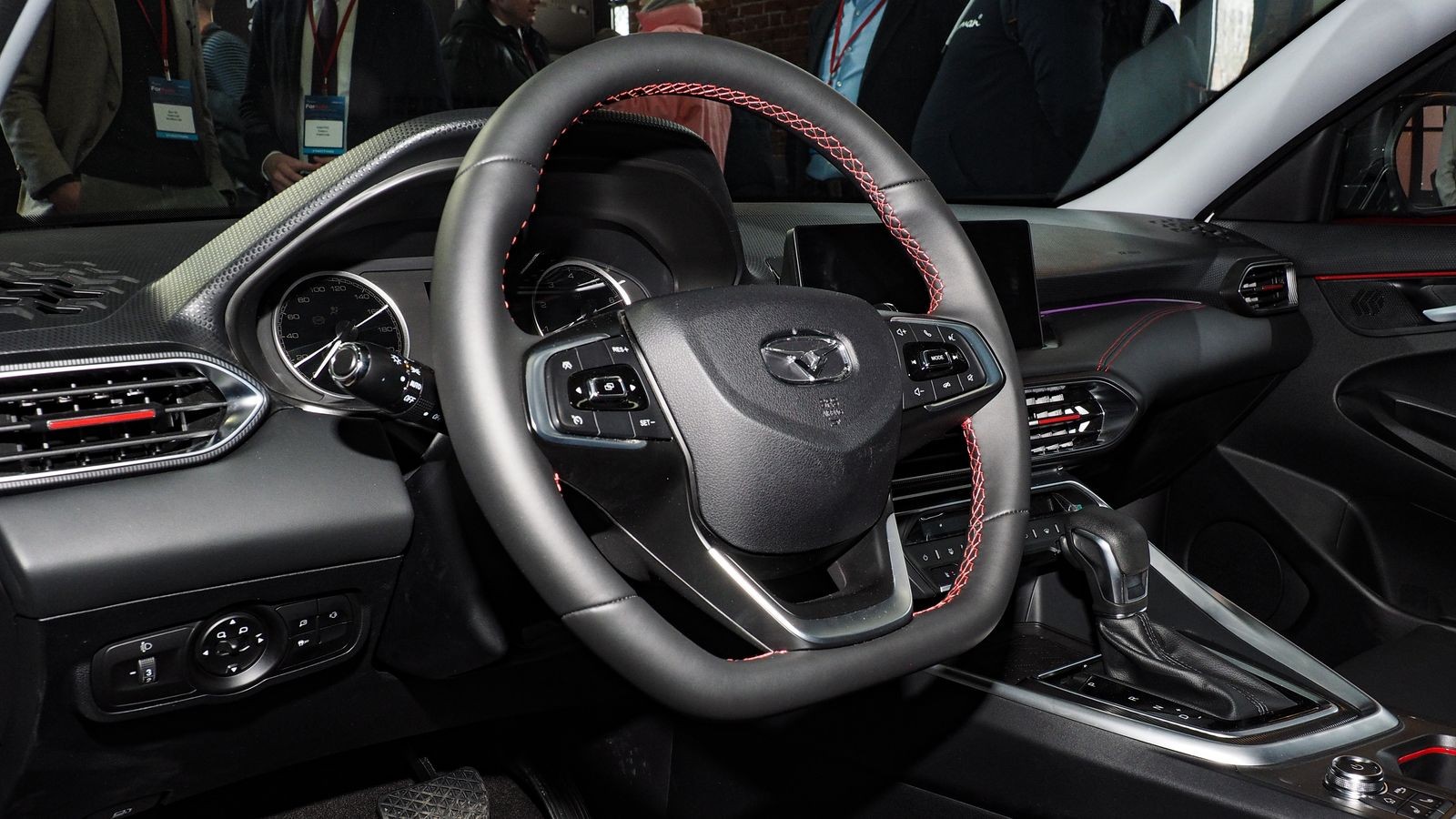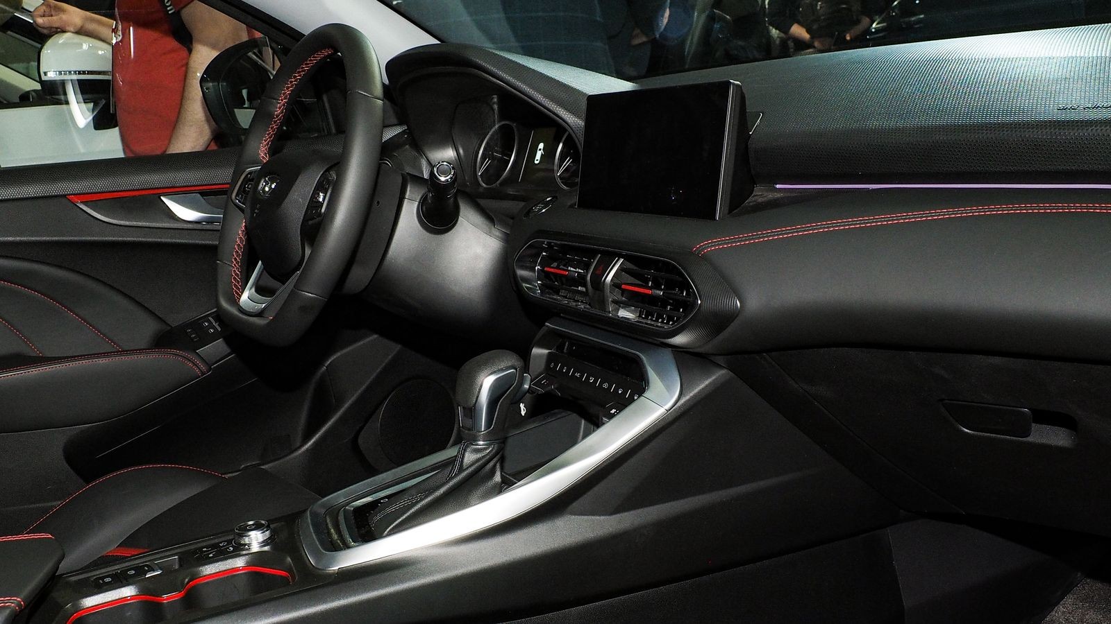 А вот оформление салона произвело самое благоприятное впечатление. Не знаю, какая цветовая гамма будет предложена потенциальным покупателям, но на представленном образце салон был оформлен «по Стендалю», то есть в стиле «красное и черное». Разбросанные по всему салону красные акценты однозначно настраивают на спортивный лад, особенно красные стреловидные вставки на черных подушках и спинках сидений. Ну а чтобы салон не получился совсем уж мрачным и «анархистским», потолок обит светло-серым материалом и снабжен люком.