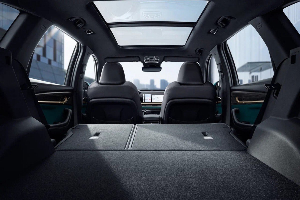 По размерам Geely Monjaro близок к актуальному Hyundai Santa Fe: длина «китайца» равна 4770 мм, ширина – 1895 мм, высота – 1689 мм, колесная база – 2845 мм. При этом SUV Джили исключительно пятиместный. Для сравнения, габариты родственного «купе» Tugella (в российской спецификации): 4605/1878/1643 мм, расстояние между осями – 2700 мм. Паспортный дорожный просвет Monjaro – 210 мм против 204 мм у Тугеллы. Объем багажника «традиционного» кроссовера – 562 литра под шторкой, со сложенным вторым рядом кресел этот показатель увеличится до 1532 литров.