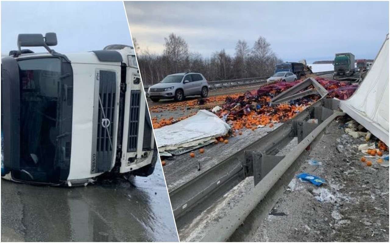 Жители близлежащих населенных пунктов могут набрать мандаринов на новогодний стол прямо на дороге: из перевернувшейся на трассе под Челябинском фуры высыпались тонны цитрусовых.