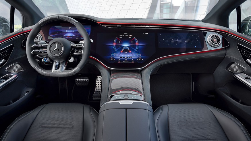 Есть отличия и в интерьере AMG-версий: у «заряженных» седанов иные руль, кресла, а так уже узнаваемые декоративные элементы. Как и «обычному» Mercedes-Benz EQE, за доплату предлагается изогнутый дисплей информационно-развлекательной системы MBUX Hyperscreen, где под единым большим стеклом объединены виртуальная «приборка», тачскрин мультимедиа и дополнительный экран для переднего пассажира. Совокупная ширина такого дисплея – 141 см.