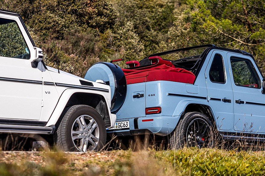 Последний стоковый короткобазный Mercedes-Benz G 500 Cabriolet (белая машина на фотографиях) увидел свет в 2013 году — то была прощальная партия из 200 машин, быстро разошедшаяся по автомобильным коллекционерам. В 2017 году дебютировал роскошный Mercedes-Maybach G 650 Landaulet, но это уже была длиннобазная 4-дверная машина, да ещё вдобавок на так называемых портальных мостах (с колёсными редукторами) — все 99 выпущенных экземпляров тоже благополучно осели в гаражах состоятельных любителей автоэкзотики. Сегодня в заводской гамме Mercedes-Benz G-класса кабриолета нет, но спрос на такую модификацию есть, его готово удовлетворить тюнинг-ателье Refined Marques со штаб-квартирой в Дубае.