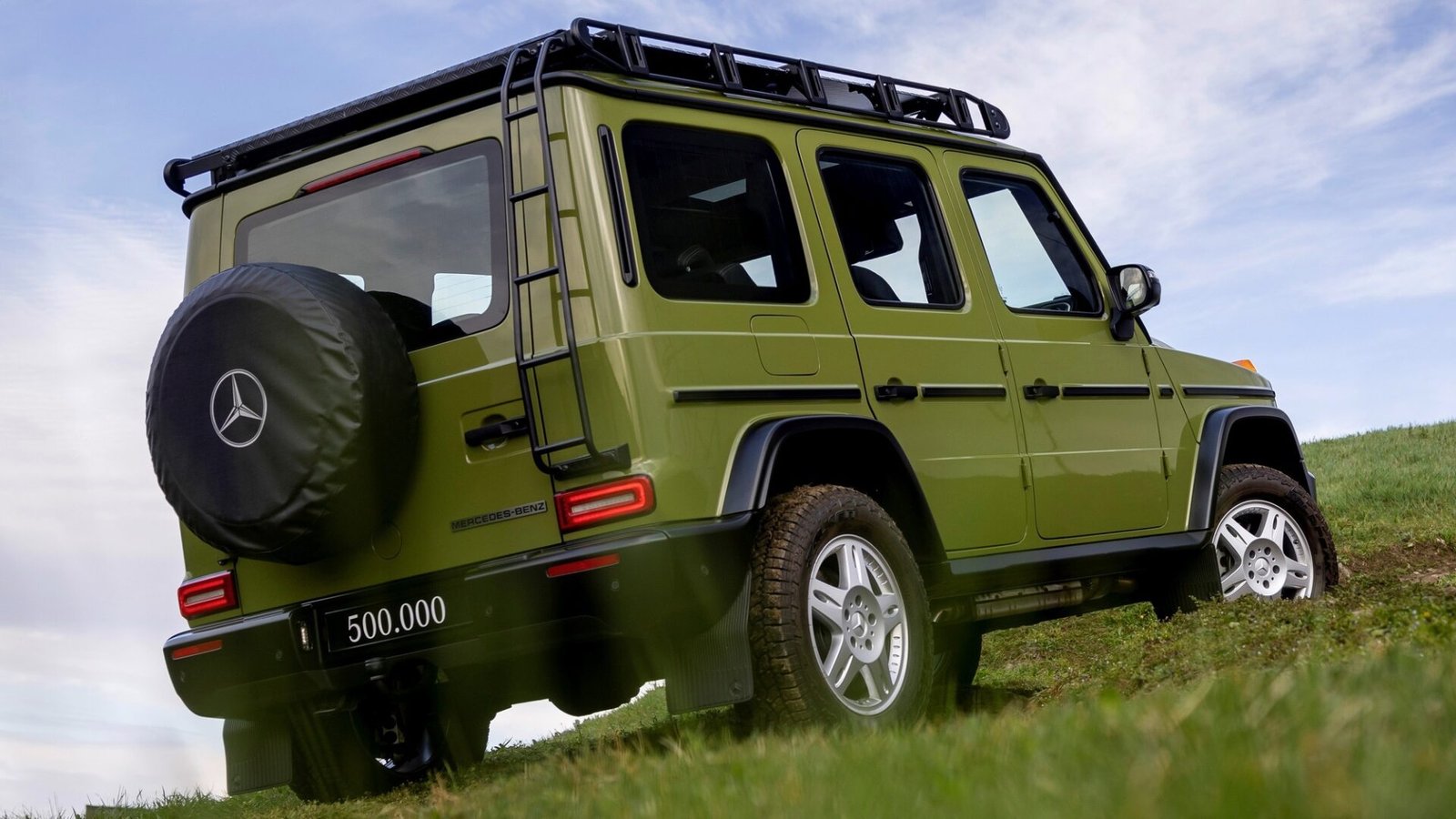 Полумиллионный Mercedes-Benz G-Class вдохновлён бензиновой версией 280 GE из далёкого 1986 года и окрашен в зелёный цвет Agave Green из палитры того времени. Пупырышки передних поворотников по старинке оранжевые (на современных «геликах» они белые). Окантовки фар и радиаторной решётки выполнены из чёрного пластика. Защитные сетки фар, чёрные бамперы и экспедиционный багажник на крыше — это часть современного декор-пакта Professional Line, а вот мягкий чехол для запаски с крупной эмблемой Mercedes-Benz и олдскульный шильдик на задней двери сделаны специально для этого экземпляра.