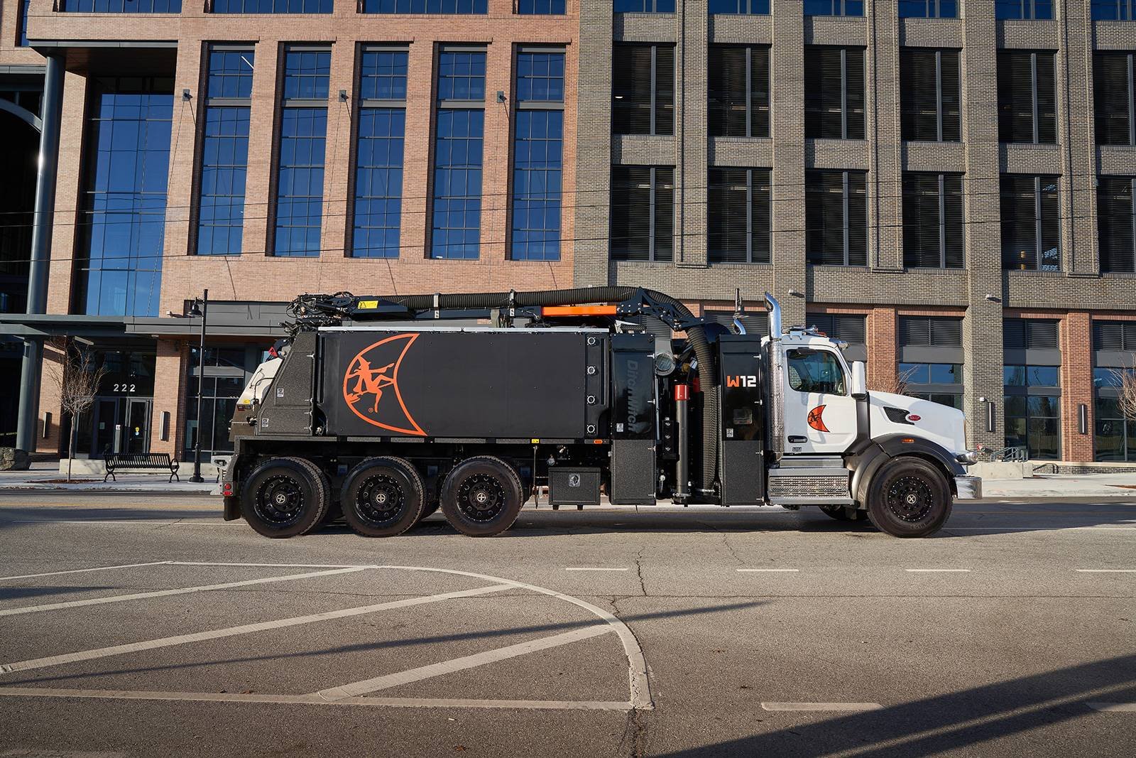 Відомий виробник комунальної техніки в США – компанія Ditch Witch нещодавно представила один із найпотужніших вакуумних автомобілів, що колись виїжджали на дороги. Це модель Warlock Series W12, яка побудована на чотиривісному шасі вантажівки Peterbilt 567 серії. Машина довжиною 10,66 м, шириною 2,43 м та висотою 3,35 м має споряджену масу 21 136 кг, а повну 35 380 кг.