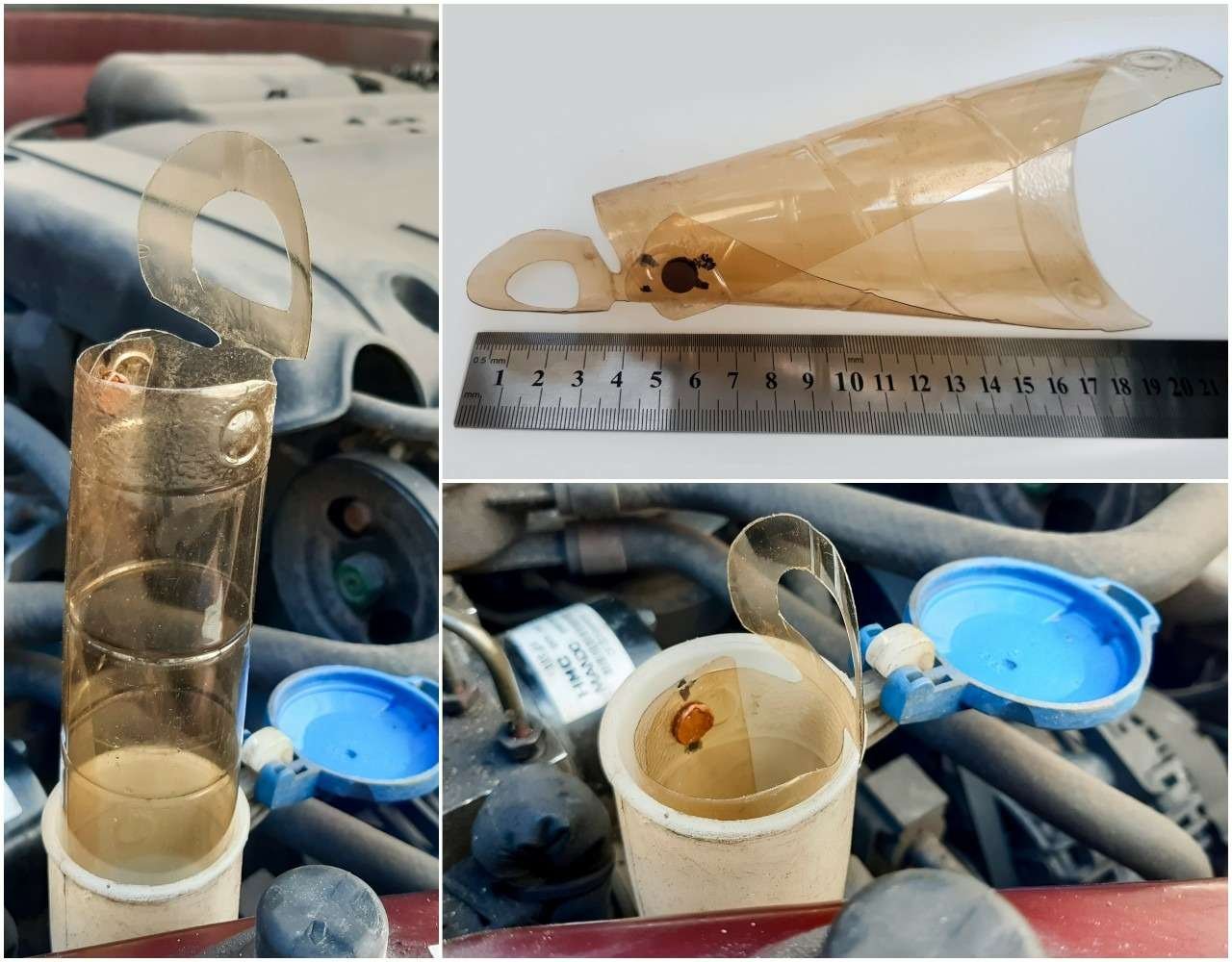 Пластиковая трубка изготовлена из пустой бутылки. С верхней стороны края ее шарнирно соединены пластиковой заклепкой — расплавленной паяльником мебельной заглушки. Нижняя сторона трубки под действием силы упругости пытается развернуться, что обеспечивает ее фиксацию в горловине бачка омывателя как в поднятом, так и в опущенном положении.