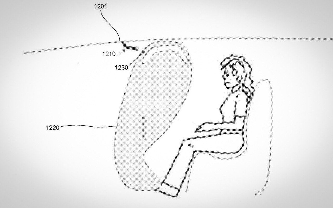 Американская компания Waymo, известная своими разработками в области беспилотных автомобилей, запатентовала подушку безопасности новой конструкции, которая буквально обволакивает пассажиров в случае аварии. Выстреливают ее части по всей высоте из-за спинок задних сидений и прорезей в потолке.