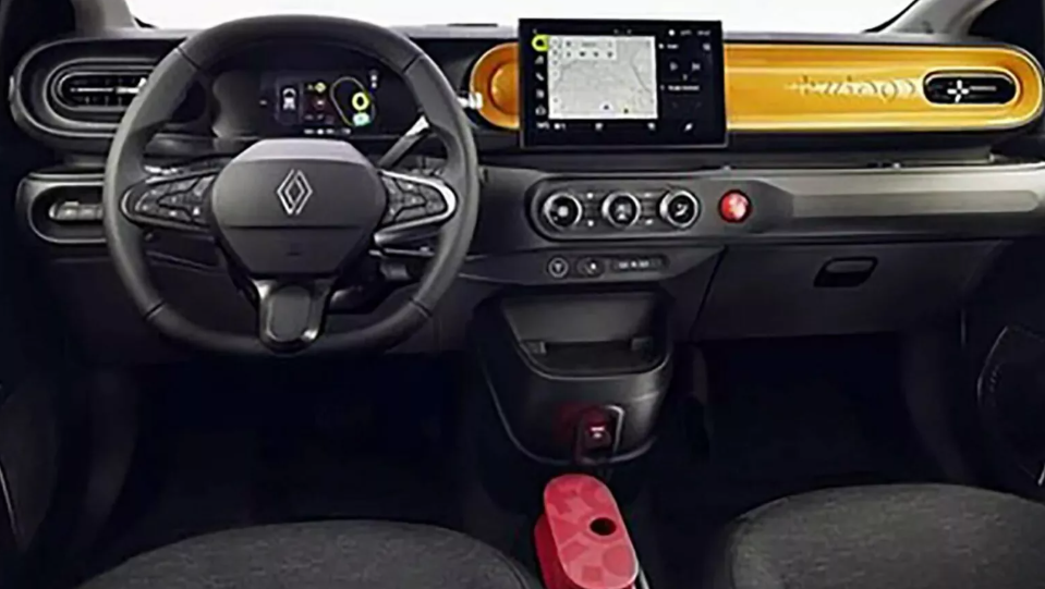 На фото показали також салон Twingo. Він багато в чому повторює індивідуальність концепту, але став стриманішим і простішим. Високоякісні поверхні шоу-кара замінені на жорсткий пластик, а сидіння тепер оббиті традиційної тканиною. Приладова панель нагадує Dacia, а екран мультимедія став менше. Вставка на приладовій панелі жовтого кольору і червона між сидіннями додають яскравих барв.