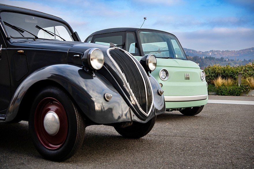 Исторический предок итальянской новинки назывался Fiat 500 Topolino и выпускался в период с 1936 по 1955 год на легендарном заводе Линготто в Турине (является памятником архитектуры). Fiat 500 Topolino при весьма скромных габаритах (габаритная длина — менее 3,3 м, колёсная база — 2 м) был полноценным автомобилем, имел рамную конструкцию и весьма необычную компоновку: 569-кубовый 4-цилиндровый бензиновый двигатель располагался перед передней осью, а радиатор водяного охлаждения устанавливался за ним со смещением вверх — такое решение позволило сделать капот покатым и добиться хороших аэродинамических характеристик кузова.