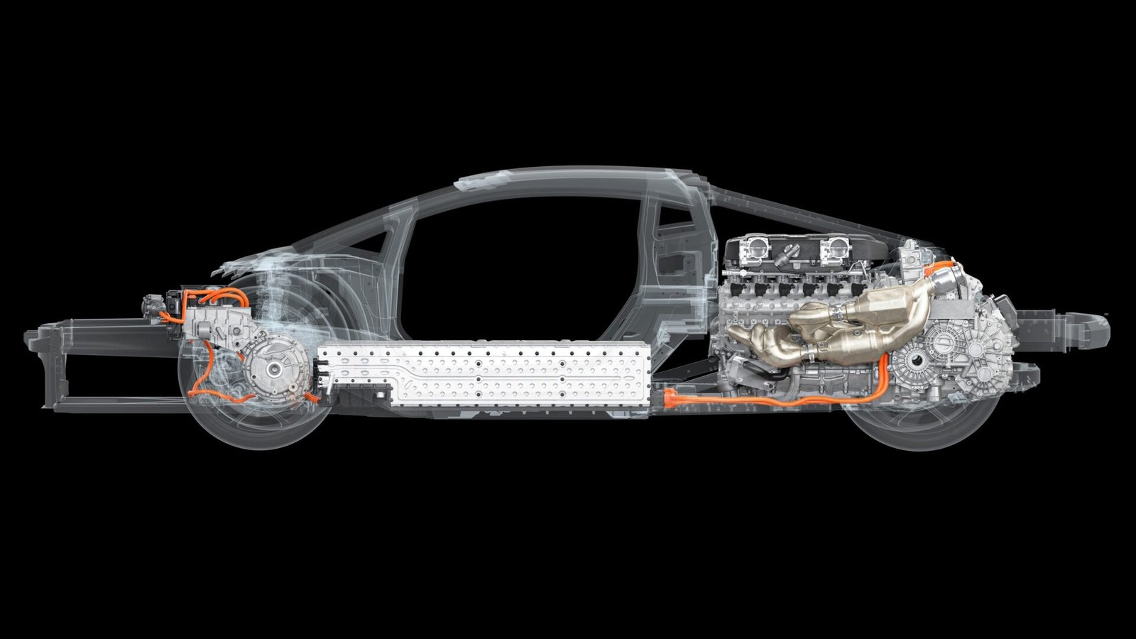 Для нового мотора спроектирована и новая коробка передач — 8-ступенчатый «автомат» типа DCT (с двумя мокрыми сцеплениями), она установлена поперечно за задней осью, в связи с чем V12 пришлось развернуть на 180 градусов (это если сравнивать с компоновкой Авентадора), маховиком назад. Сама коробка — двухвального типа без задней передачи, сверху над коробкой установлен электромотор с максимальной отдачей в 110 кВт (150 л.с.) и 150 Нм — он выполняет роль стартер-генератора, но может также вращать без участия ДВС задние колёса, в том числе при движении задним ходом. Коробка вместе с электромотором весит 193 кг.