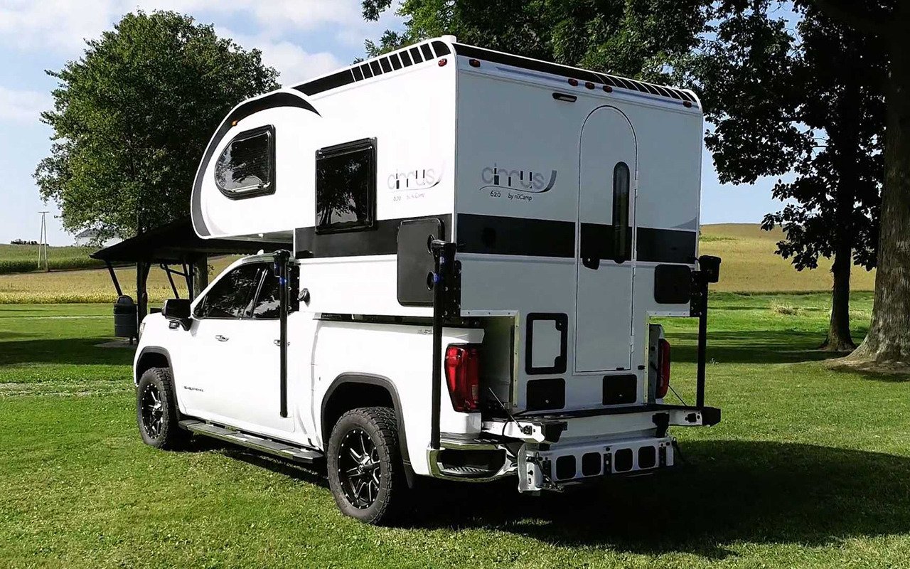 Компания NuCamp предлагает универсальное решение для владельцев среднеразмерных пикапов — модель Cirrus 620. Основное достоинство «скворечника» в том, что он весит менее 680 кг. Он годится для автомобилей как с однорядной, так и с двухрядной кабиной.