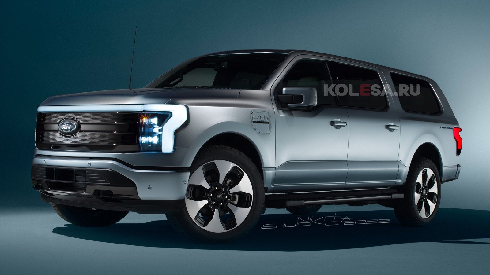 Ещё одна тенденция современного автомобилестроения – появление всё большего количества электромобилей. Например, концерн GM недавно возродил имя Hummer, дав его флагманскому внедорожнику и пикапу на электрической платформе. Ford вполне мог бы дать свой ответ GM, ведь в его истории тоже был огромный внедорожник, который сегодня мог бы возродиться в виде электромобиля. Поэтому мы взяли за основу для рендеров электрическую версию пикапа Ford F-150 Lightning, премьера которого состоялась в мае 2021 года. По длине этот «младший» пикап даже превосходит Excursion, сделанный на базе больших пикапов – 5911 против 5760 мм у последнего, ширина и высота при этом различаются в пределах нескольких миллиметров в пользу Lightning. Колёсная база также заметно больше у нового пикапа и составляет 3696 мм, показатель Excursion – 3482 мм. Помимо кузова, отличием представленного на рендерах внедорожника являются более широкие задние двери.