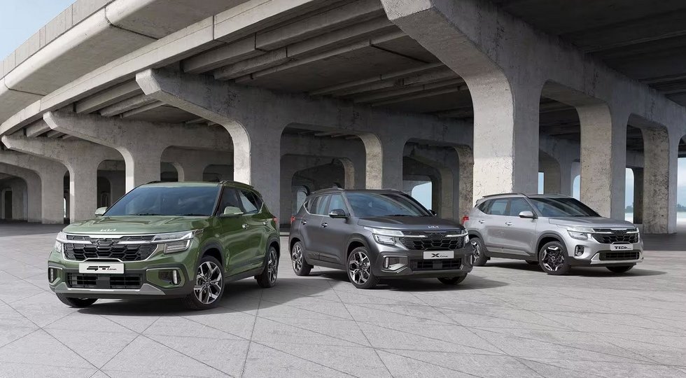 Слева направо: обновленные индийские Kia Seltos GT Line, Seltos X Line и стандартный кроссовер