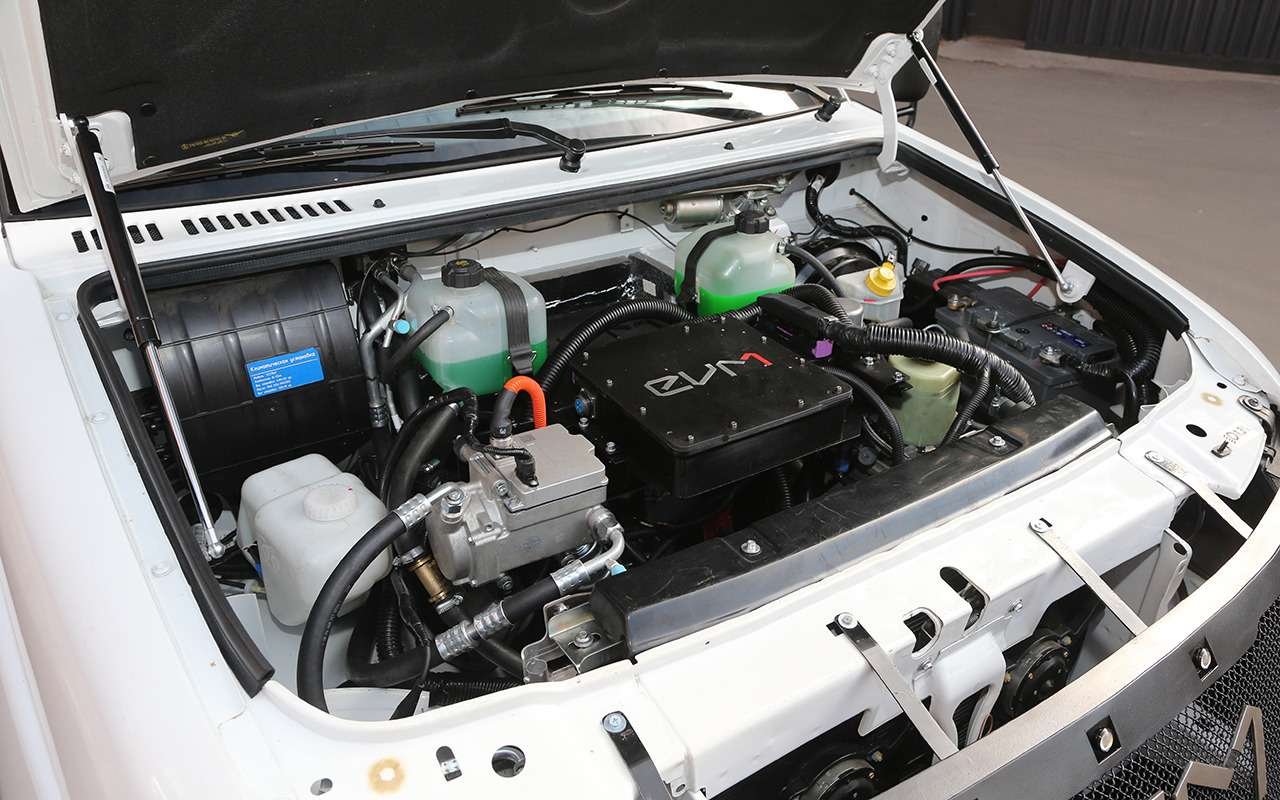 По сравнению с бензиновым УАЗом электромобиль потяжелел на 500 кг. А значит и грузоподъемность снизилась — одна тонна вместо полутора.