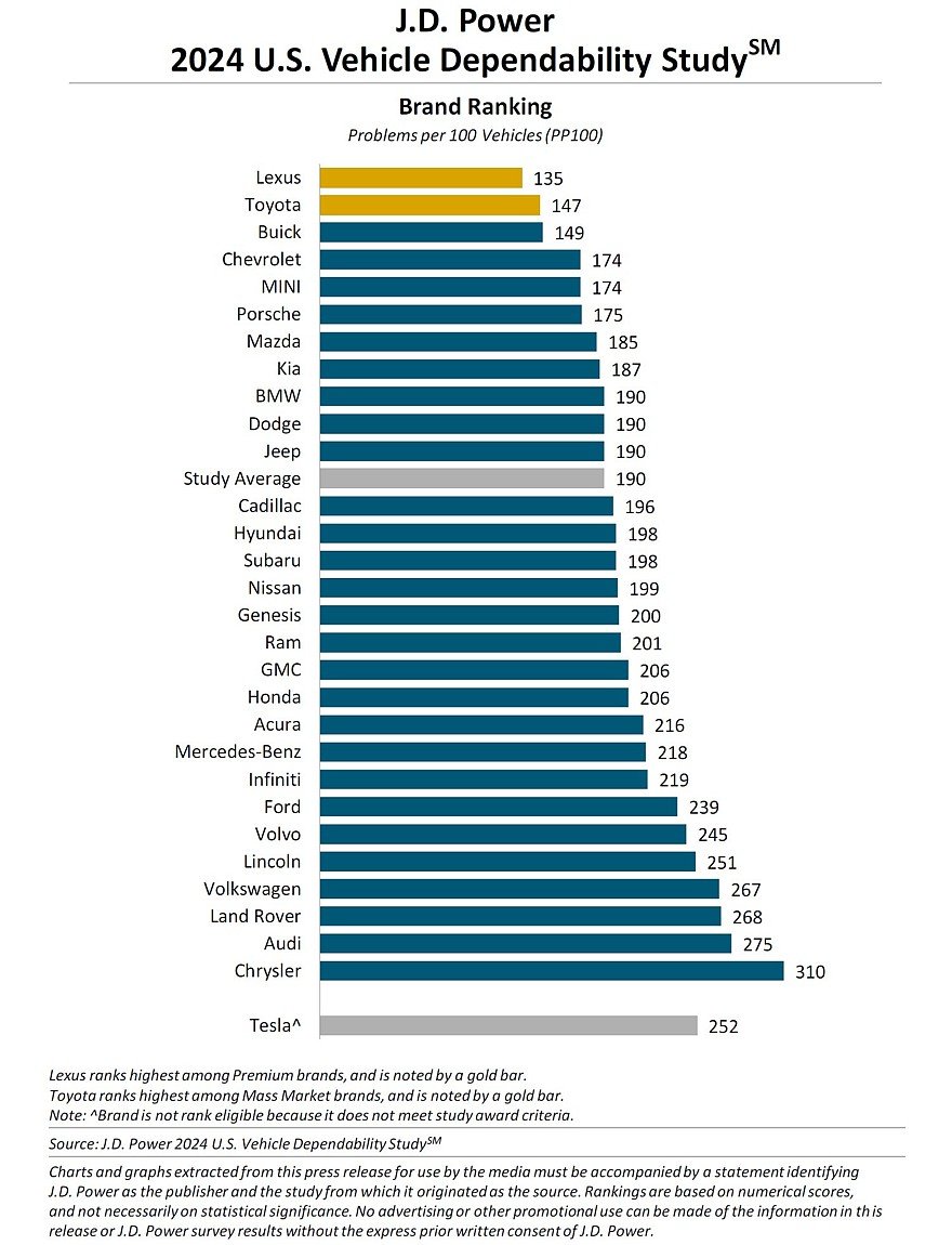 Рейтинг надёжности J.D. Power 2024: проблемные электромобили, падение Kia и Hyundai