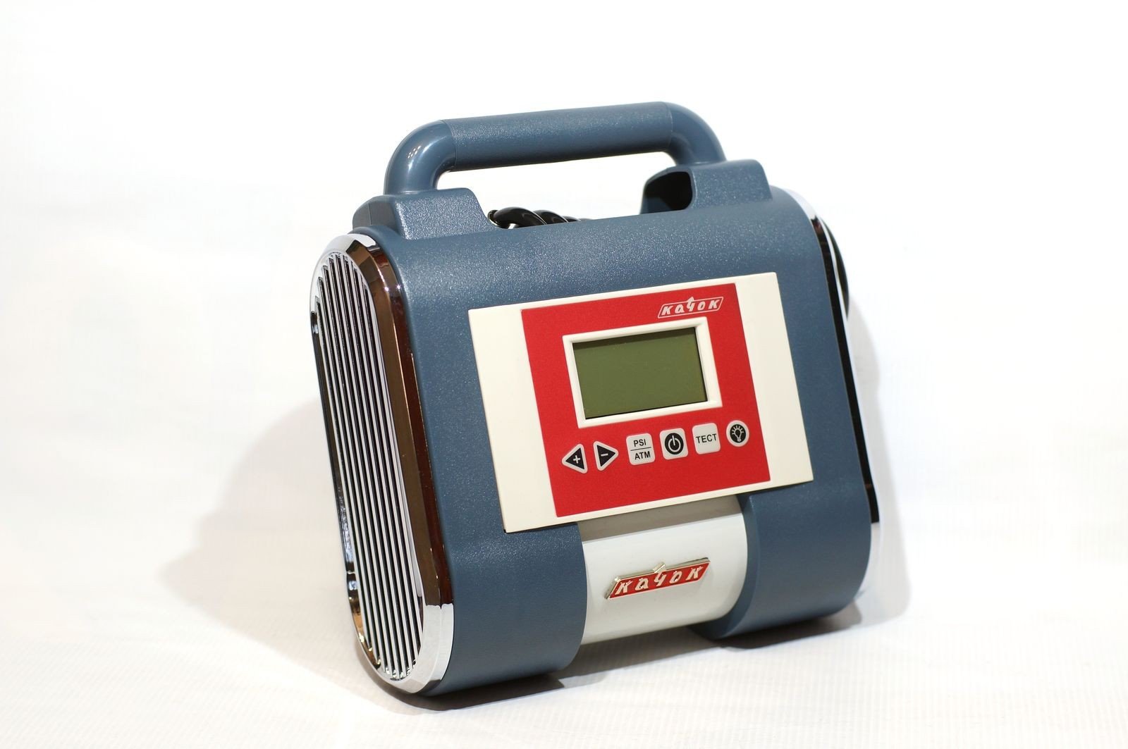 Компрессор выглядит, как портативный носимый радиоприемник из 60-х. Если, скажем, смешать в неком «3D-миксере» очертания носимых приемников «Турист» 1956 года и «Спидолы» 1960-го, да добавить хром от приемников семейства «ВЭФ» и «Сокол», то как раз получится что-то подобное. Впрочем, важно понимать, что цели повторить какой-то приемник (да и радио вообще!) не было. Ставилась цель попасть в стиль и атмосферу, задействовав комплексный, собирательный дизайн. И, надо сказать, отлично получилось! Сверкающие хромированные боковины, двухцветная окраска, как у старых авто, сглаженные очертания, рельефный шильдик «Качок» с характерным шрифтом, напоминающий не то логотип «Москвича», не то холодильника «ЗИЛ» – все это цепляет взгляд, и современный ЖК-дисплей замечаешь не сразу.