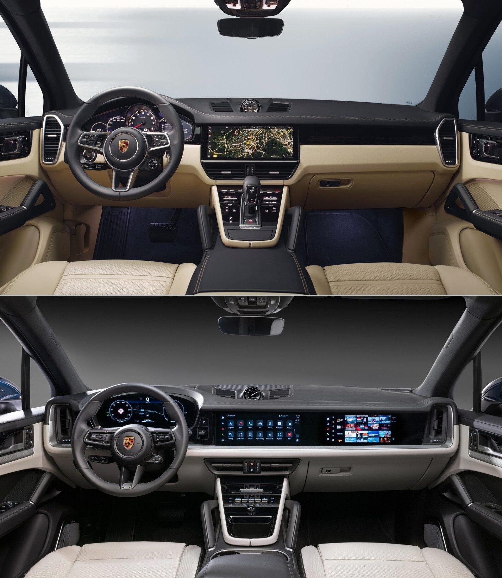 Салон Porsche Cayenne третьего поколения до рестайлинга (сверху) и после рестайлинга (снизу)