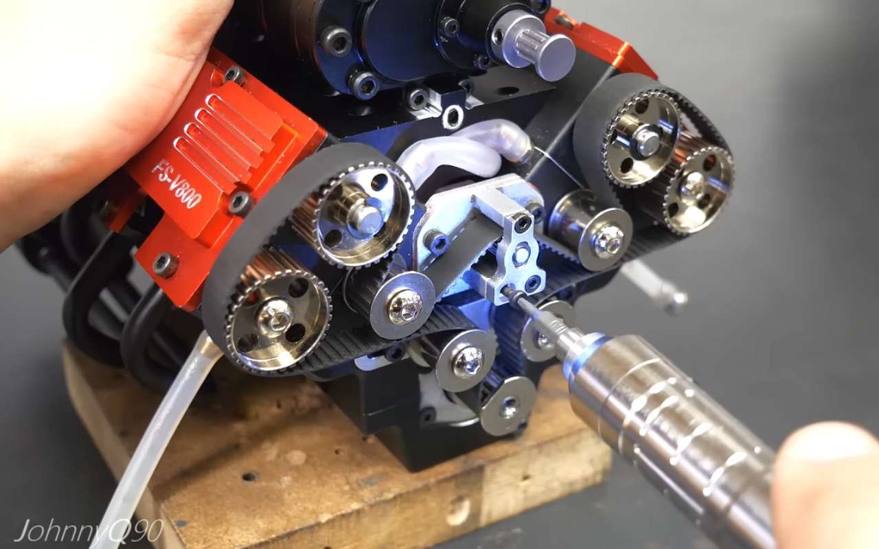 Девятиминутный ролик начинается с установки нагнетателя. Затем устанавливается ремень ГРМ. Это не так сложно, как на настоящем моторе, но работа очень даже кропотливая, учитывая количество роликов и валов, которые необходимо соединить. Далее следует проверка меток — и двигатель готов к первому пуску.