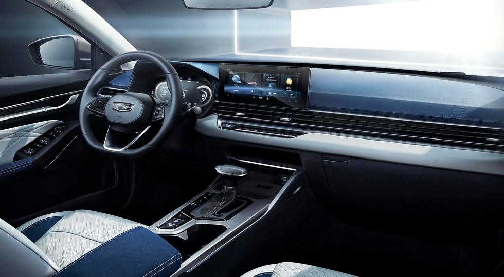 Особенности дизайна экстерьера – крупная радиаторная решетка с вогнутыми вертикальными клиньями, светодиодные штрихи ходовых огней и объединяющая фонари светящаяся полоска (вся оптика тоже диодная). Кроме того, в задних стойках появились дополнительные окошки. Внутри – крупный «парящий» тачскрин мультимедиа-системы и спрятанные в единую плашку дефлекторы обдува. А еще в Geely ранее заявили о том, что в салоне степень покрытия мягкими материалами составляет 85%.