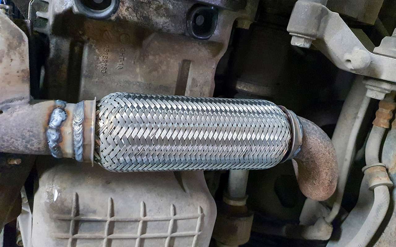 Двигатель на Кобальте стал шумно работать на холостых оборотах. Решил проверить систему выпуска. Обычно в первую очередь прогорает элемент, находящийся под постоянной механической нагрузкой — термокомпенсатор промежуточной трубы глушителя (проще — гофра). Так и оказалось. Но 147 тысяч км пробега для нее — достойный результат.