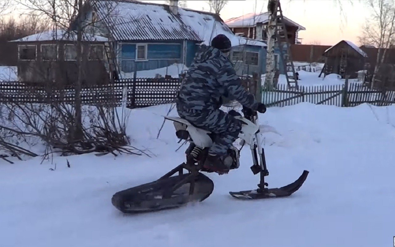 За основу взят небольшой кроссовый пит-байк. Вместо переднего колеса — самодельная лыжа, качающаяся вокруг точек крепления к амортизаторам, а сзади — сборная конструкция из деталей от старого снегохода и самостоятельно изготовленных элементов. Гусеница у снегоцикла сделана из шипованной шины размером 18". На создание этого транспорта ушло два месяца работы в гараже.