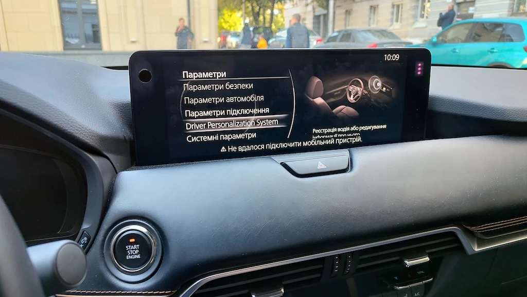 Як стверджують дизайнери Мазда, вони прагнули створити інтер’єр спокійним, елегантним та витонечним – тож роздивляючись його з водійського місця можу це засвідчити. Лінії дизайну лаконічні та спокійні, а серед матеріалів м’які пластики, шкіра та вставки під алюміній. Сидіння оздоблено шкірою Nappa, що є особливістю комплектації Premium. Також серед переваг цієї комплектації (якщо казати про салон) вентиляція передніх сидінь, електричне регулювання керма, безрамкове дзеркало, панорамний люк, акустика Bose на 12 динаміків та система персоналізації. Цікавою опцією є функція Driver Personalization System. Вона цікава тим, що при достатньо створити особистий профіль в системі, задати свій нік та вказати зріст. Система сама пропонує водієві підлаштування крісла, керма та зовнішніх дзеркал. За допомогою камери авто кожен раз розпізнає водія, коли він сідає за кермо, та активує його профіль зі збереженими налаштуваннями положення сидіння, керма, його плейлист аудіо. Для сімейного авто, де часто змінюються водії це зручно.