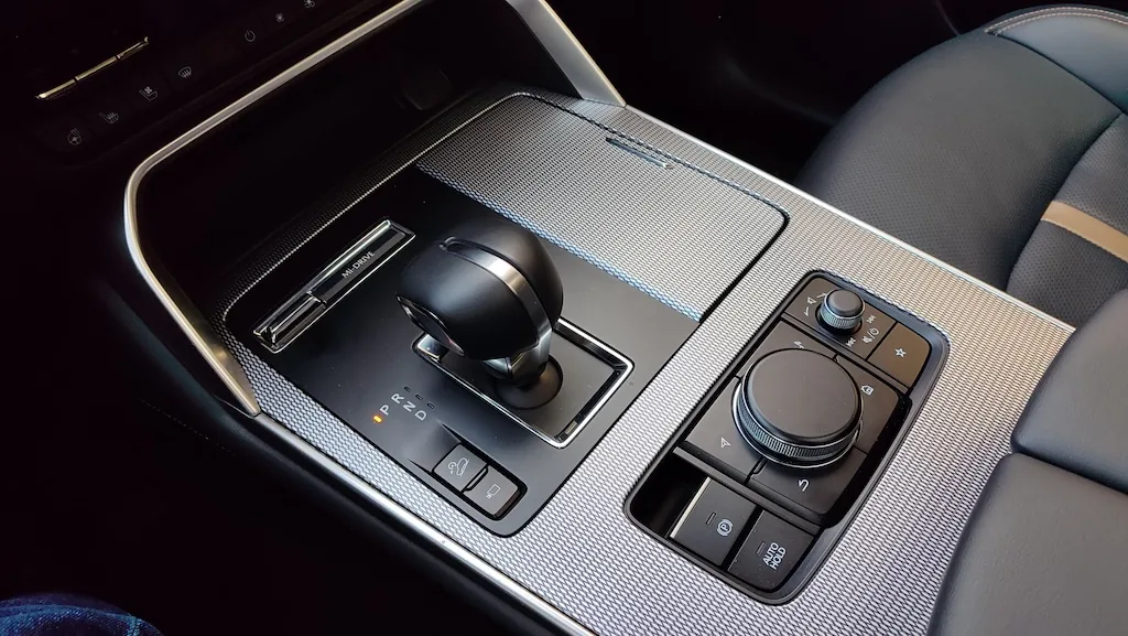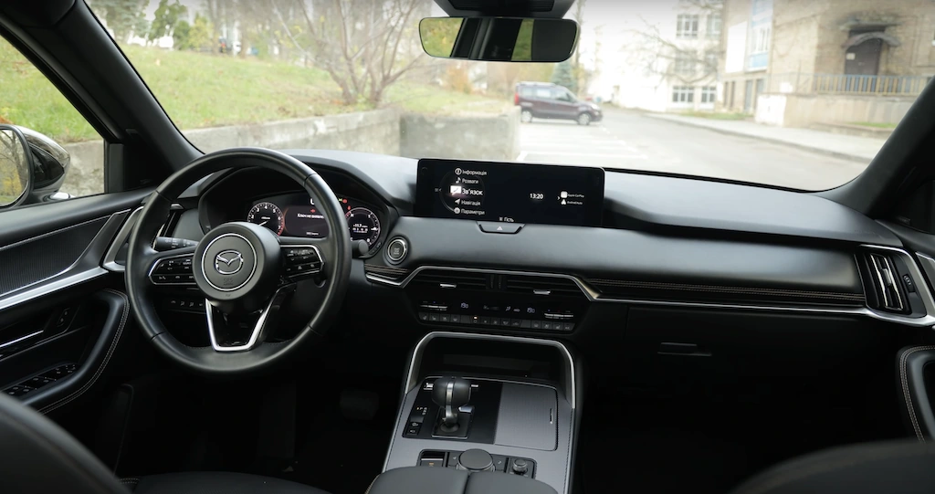 Посадка за кермом зручна – це стосується і профілю сидінь і взаєморозташування основних органів керування. Широка центральна консоль водночас і натякає на великі розміри Mazda CX-60 та ширину її салону, і краде вільний простір у водія та переднього пасажира. Але певно інакше і не можна було зробити, адже зміщений ближче до центру автомобіля двигун посунув також і автоматичну коробку передач.