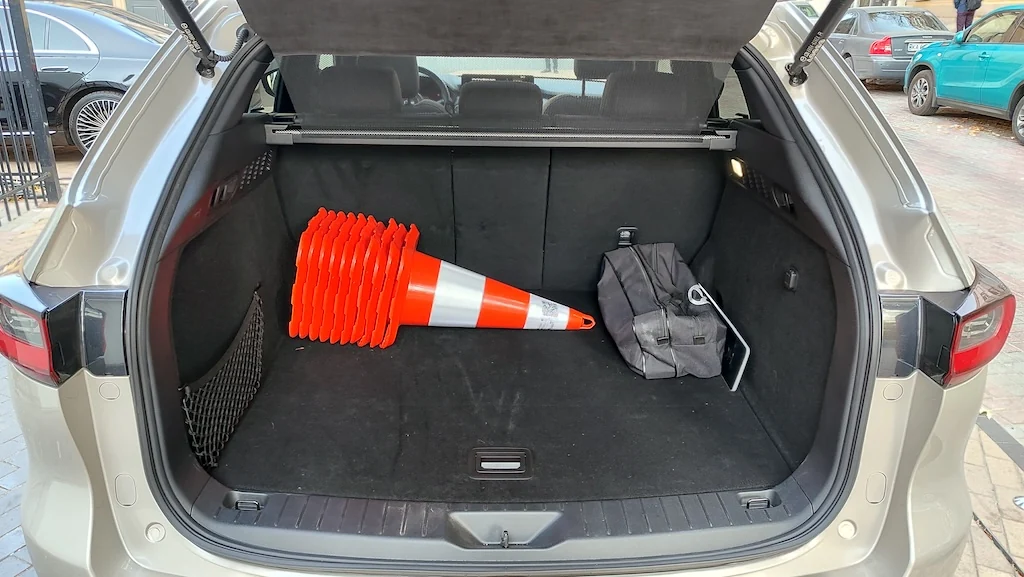 Багажне відділення має приємне м’яке оздоблення і об’єм 570 літрів. І це десь на 100 літрів більше, ніж у молодшої моделі CX-5. Під міцною фальш-підлогою розташоване тимчасове запасне колесо, а збільшити простір для габаритного багажу можна складаючи спинки другого ряду по частинах, у пропорції 40/20/40. Цікаво також, що полиці для приховування багажу тут немає, а є легка шторка, що піднімається разом з дверима багажнику. Просте та зручне рішення.