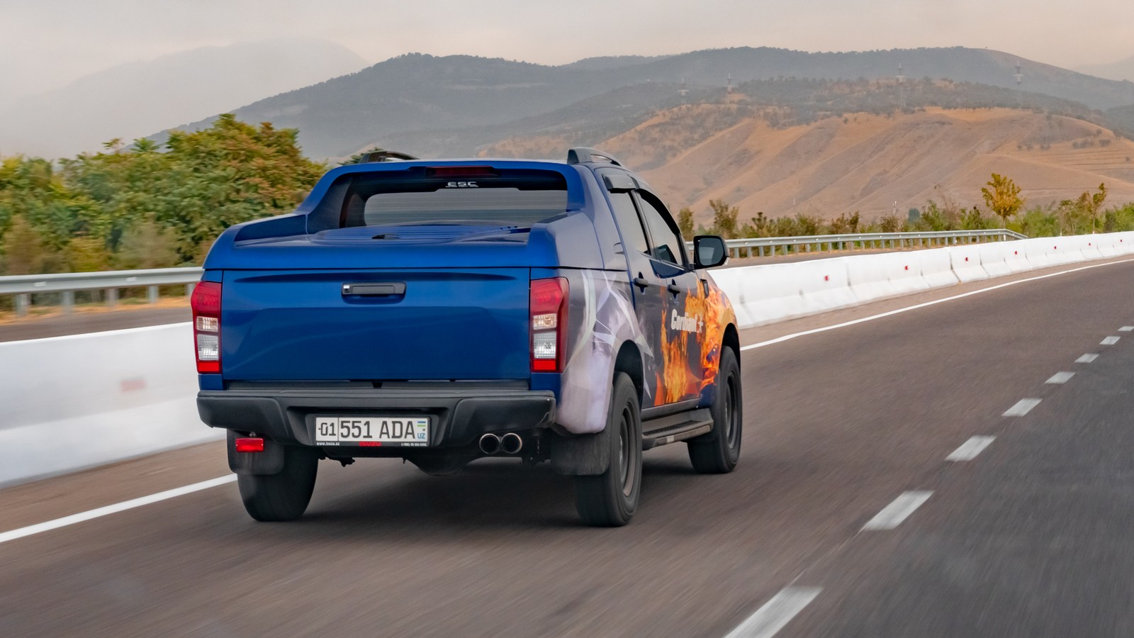 Первое, что нужно отметить, это шумовой и вибрационный фон. В качестве «носителей» шин для теста были выбраны пикапы Isuzu D-Max с дизельными моторами на 2,5 и 3 литра – их очень кстати выпускают здесь же, в Узбекистане, на заводе СамАвто. И на фоне умеренного тарахтения дизеля шум от шин не выходит на первый план вплоть до максимума разрешенных скоростей. Дороги в Узбекистане разнятся по состоянию от «хорошо» до «не очень», и даже трасса, соединяющая Ташкент и Самарканд, не отличается однородностью: по большей части это вполне приличное шоссе, но местами встречаются участки с щербатым асфальтом, а то и откровенными ямами. Само собой, мягкие высокопрофильные шины не пасуют на выбоинах, но главным стало то, что они совершенно не раздражают в пути и не напоминают о себе на протяжении 200-300 километров. То же самое касается вибраций: число грузов на штампованных колесах намекает на то, что эти грязевые шины вполне поддаются балансировке, а в движении по ровному асфальту на руль не приходит тремор от крупных шашек протектора. Управляемость на асфальте тоже не вызывает никаких вопросов: шина вполне по-легковому цепляется в поворотах и не дает о себе знать визгом на привычных скоростях при маневрировании. Дизельный пикап с инертным рулем не провоцирует на активное вождение на асфальте, так что до предела возможностей шин мы, разумеется, не добрались – но не это ли говорит о том, что потребительские характеристики получились достаточными для шины с маркировкой M/T?