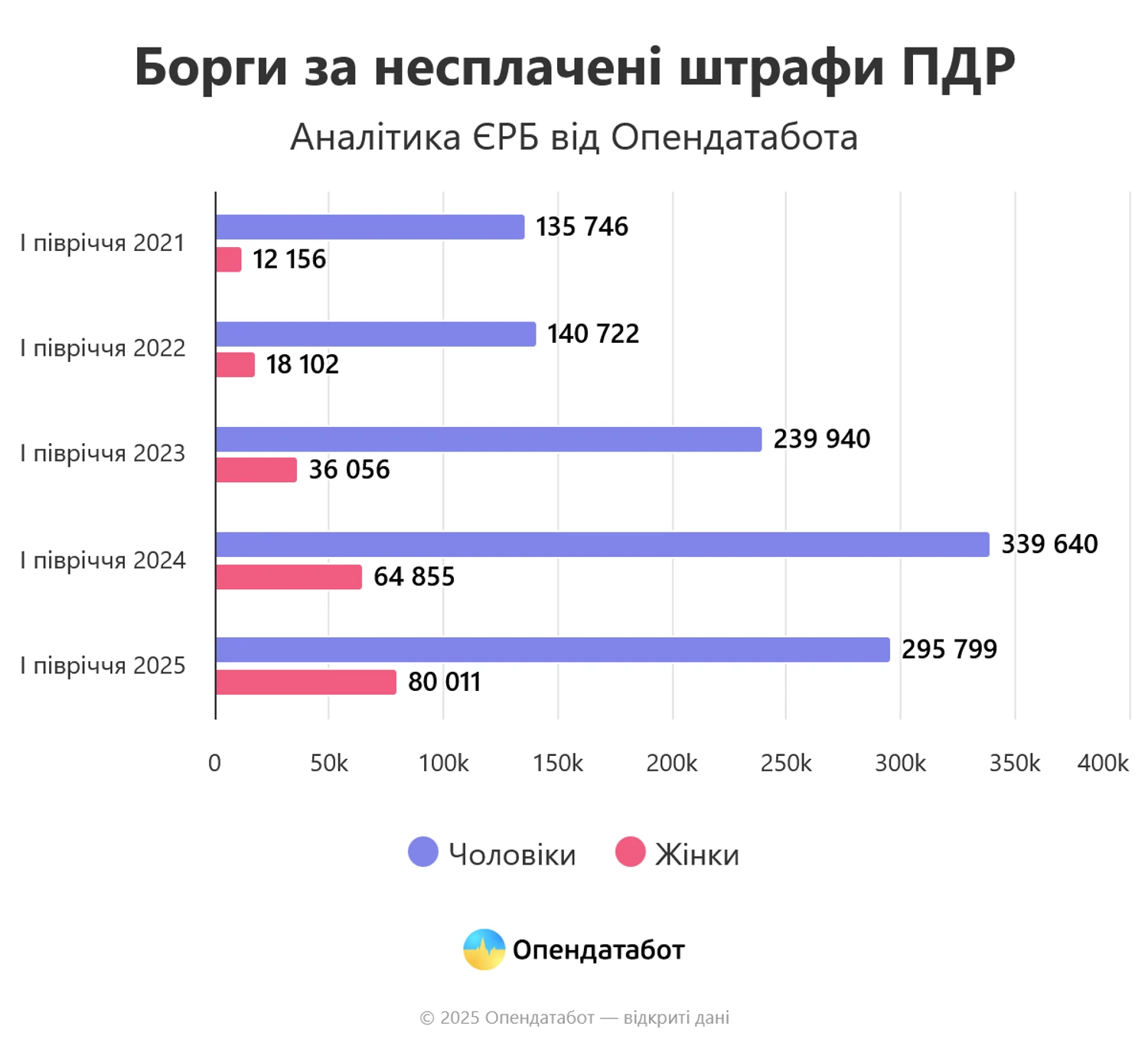 В Украине почти 2 миллиона долговых производств связаны с неуплаченными штрафами за нарушение ПДД. С начала года Единый реестр должников пополнился на 375 810 новых записей, преимущественно мужчинами 25-45 лет, но доля женщин выросла до 21%.
