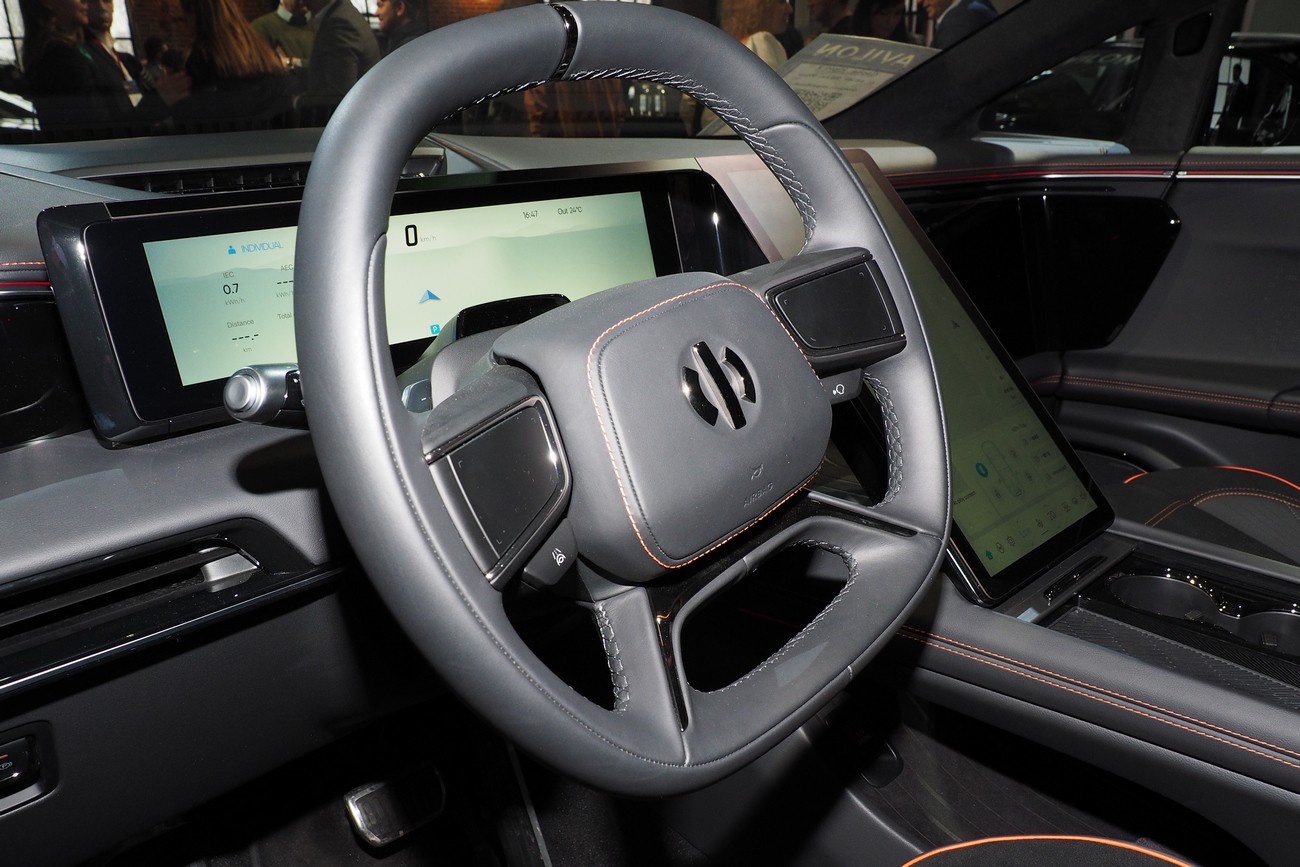 Что же касается рабочего места водителя, то первое, на что обращаешь внимание, это все то же отсутствие физических кнопок, ротор-контроллеров и клавиш. Разве что подрулевые переключатели на руле имеют вполне традиционную конструкцию. Все остальное заменяют сенсорные панели. Ими оснащены даже спицы овального футуристического руля.