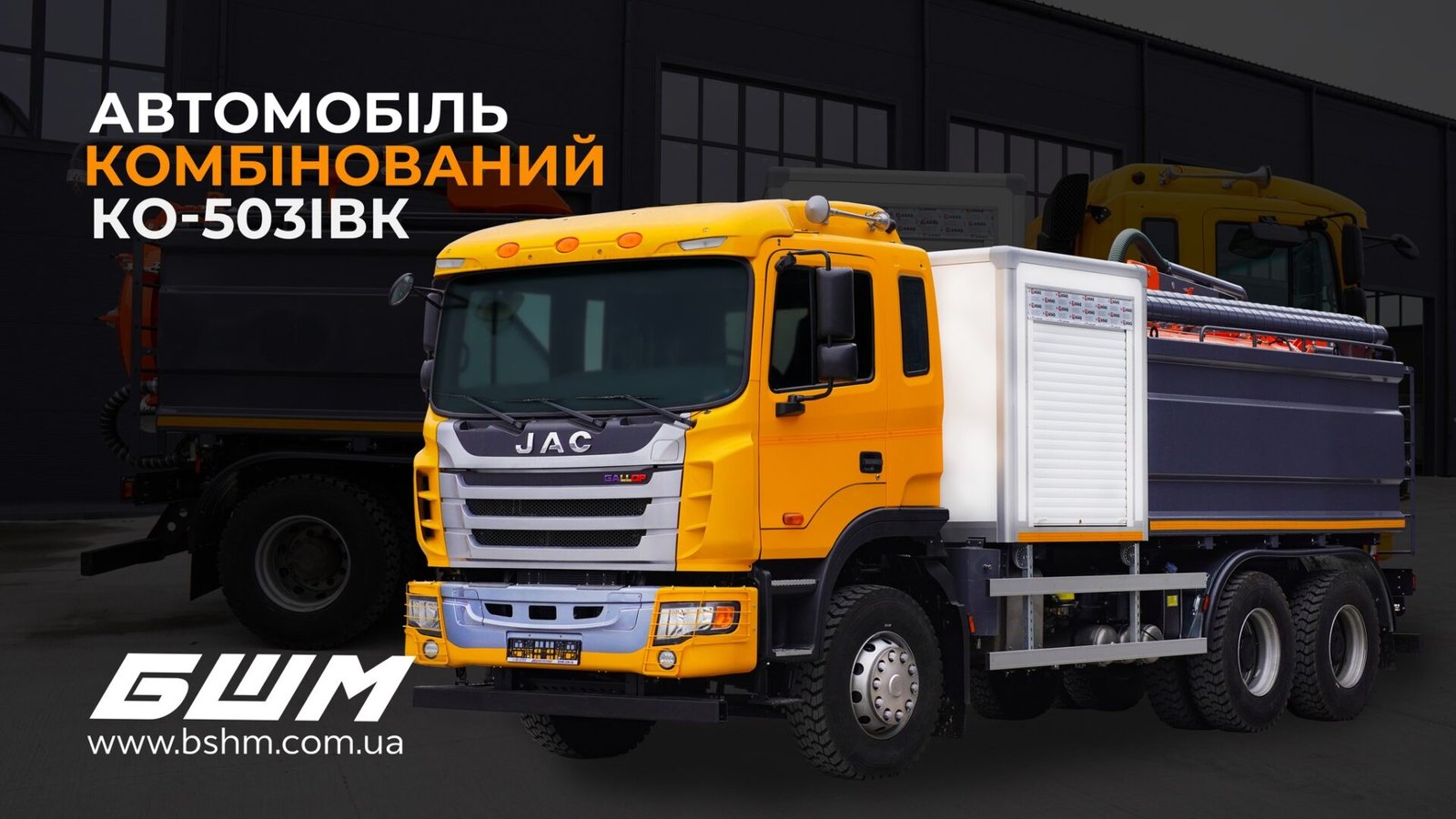 Група компаній «Будшляхмаш» виготовила та передала замовнику комбінований комунальний автомобіль КО-503IBK на шасі JAC N350. Це багатофункціональна модель, яка поєднує функції відразу трьох спеціалізованих автомобілів: вакуумного, мулососного та каналопромивного. Відсік із різним обладнанням оснащений автономним обігрівачем Webasto.