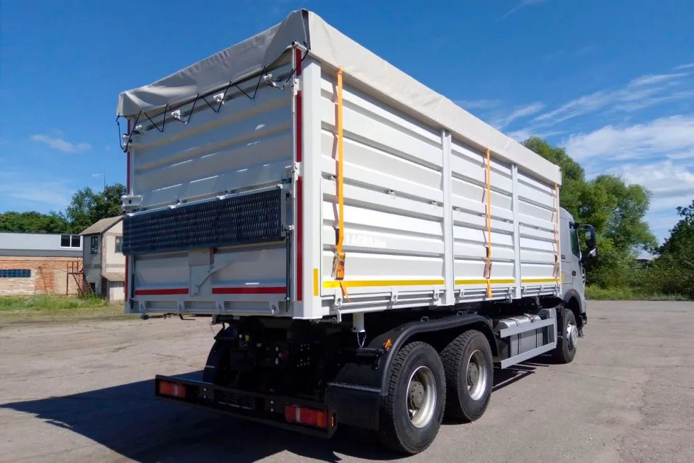Новинка AGRiLine 35 має кузов завдовжки 6200 мм, завширшки 2500 мм та заввишки 2300 мм. Він розвантажується на дві сторони – назад та праворуч. З лівого боку борти неробочі, а ось з правого можуть відкриватися нижні борти. Що ж до задніх бортів, то нижній може підніматися, а верхній зроблений розпашним. При необхідності відкриватися вбік може і вся задня стінка з двома бортами. Каркас кузова виготовляється із високоміцної сталі CТ3/Strenx 700.