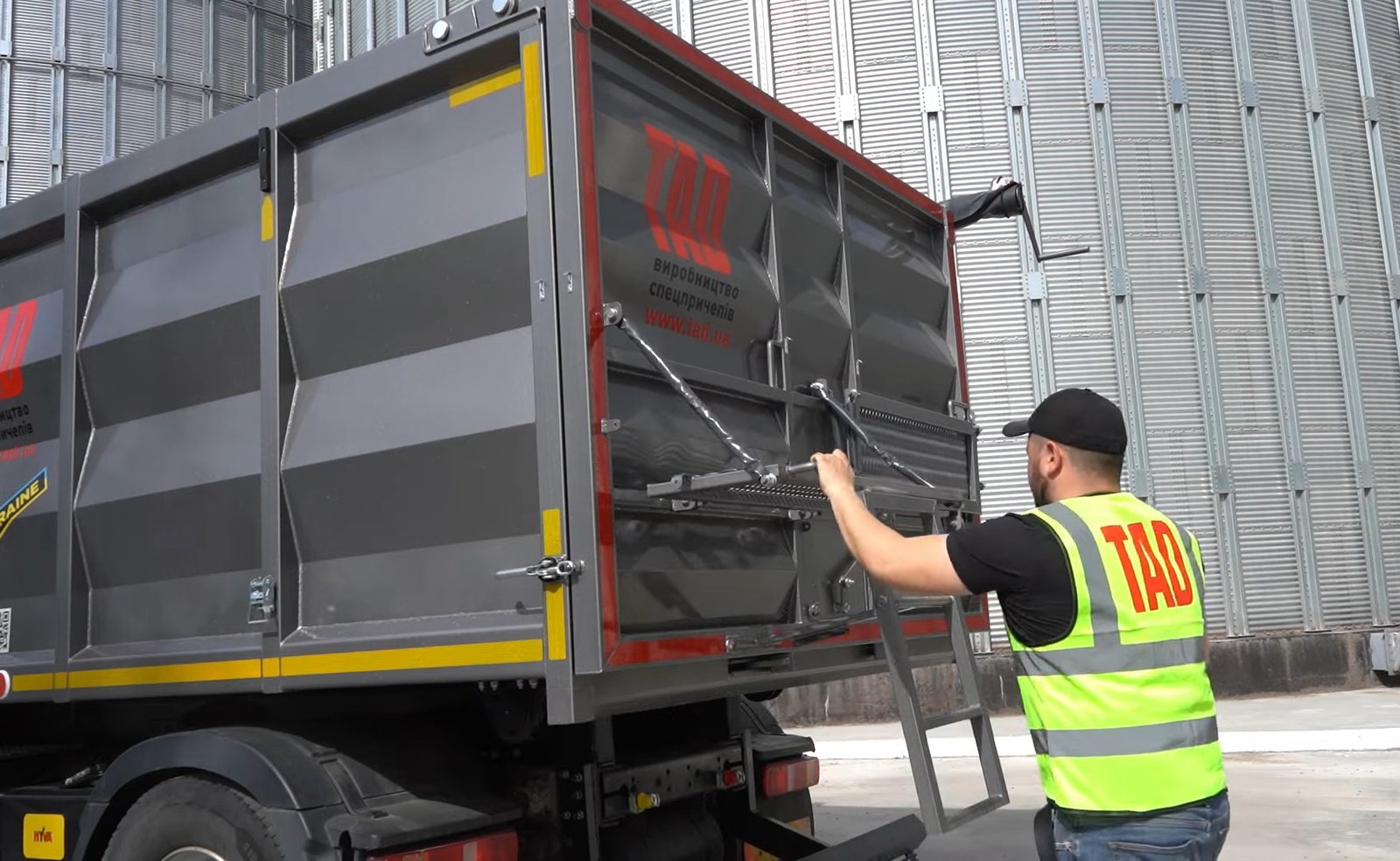 Фахівці TAD демонтували сідлово-зчіпний пристрій, встановили надрамник, гідравлічний підйомник Hyva і, звичайно, кузов. Платформа виготовлена із сталі марки S355 – з товщиною бортів 2 мм та підлоги 5 мм. Кузов має корисний об’єм 16 кубометрів та важить при цьому 2400 кг. Задній борт обладнаний лючком для розвантаження та відкидним майданчиком для зручності роботи зі зсувним тентом.