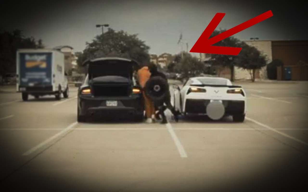 Черный Dodge Charger аккуратно паркуется рядом с белым Chevrolet Corvette, из подъехавшей машины выходят два человека и начинают неторопливо, но вполне квалифицированно, с использованием электрического гайковерта откручивать заднее колесо Корвета!